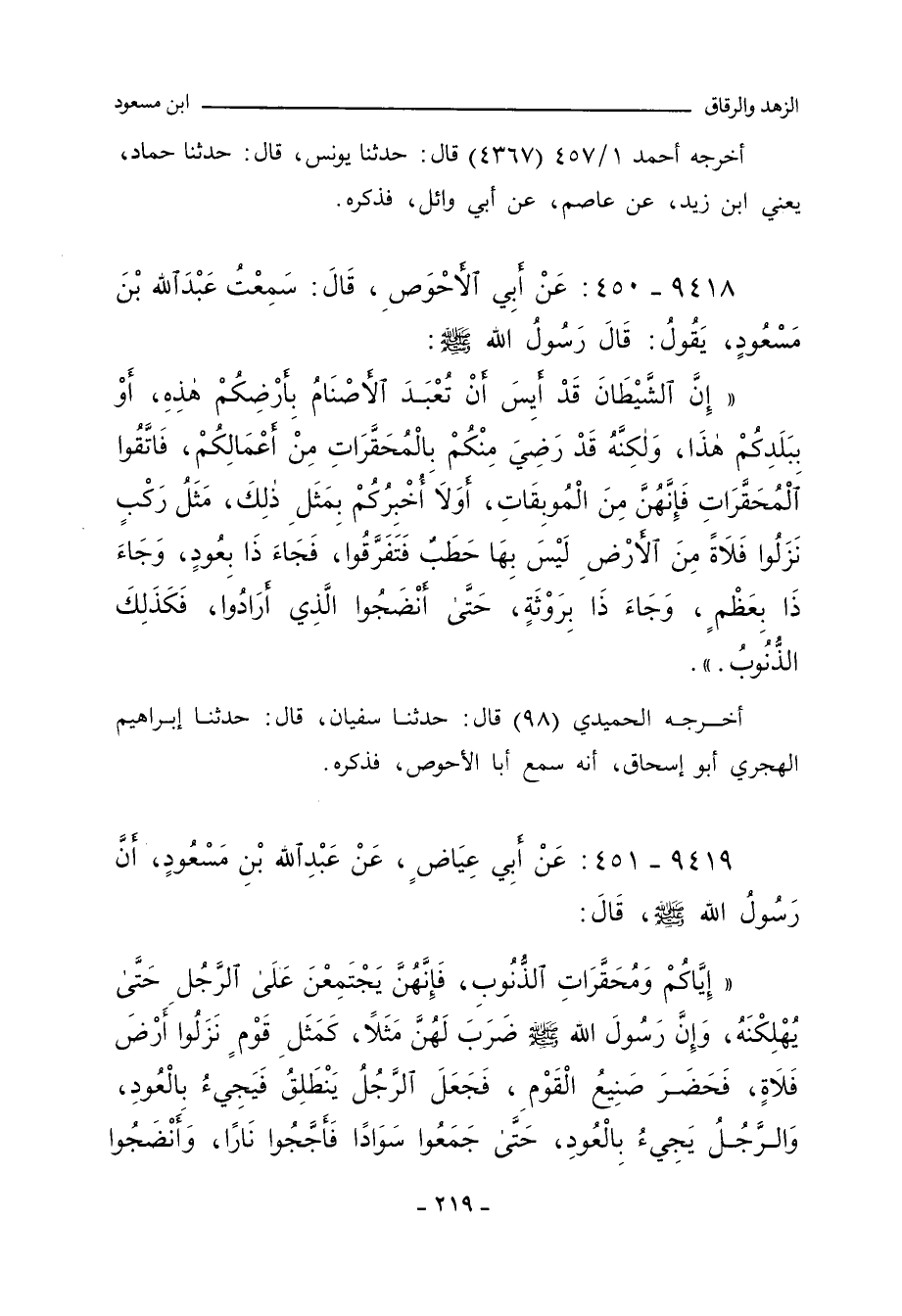 ٩٤١٨ - عَنْ أَبِي الأَحْوَصِ , قَالَ: سَمِعْتُ عَبْدَ اللهِ بْنَ مَسْعُودٍ يَقُولُ: قَالَ رَسُولُ اللهِ صلى الله عليه وسلم: