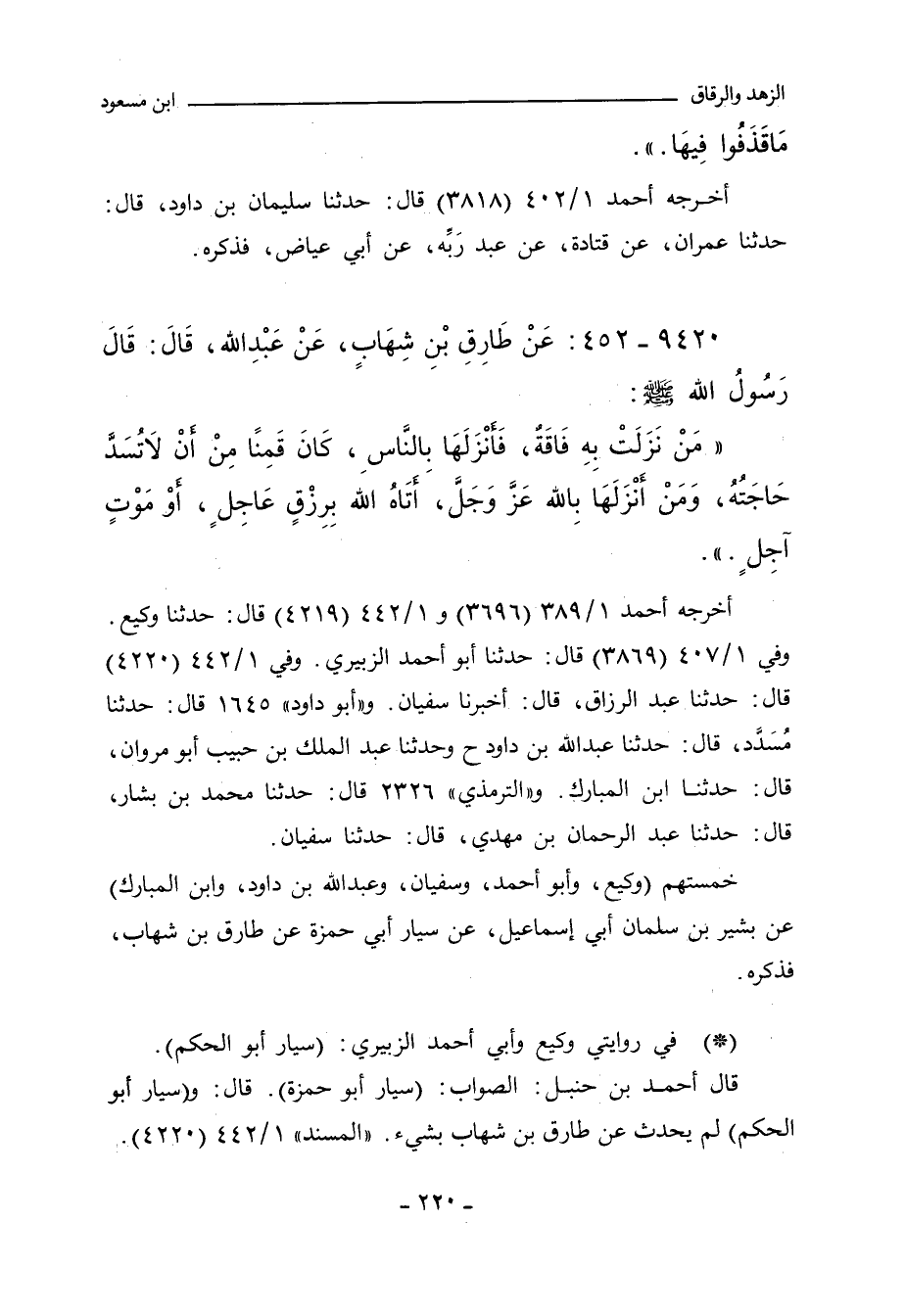 ٩٤٢٠ - عَنْ طَارِقِ بْنِ شِهَابٍ، عَنْ عَبْدِ اللهِ، قَالَ: قَالَ رَسُولُ اللهِ صلى الله عليه وسلم:
