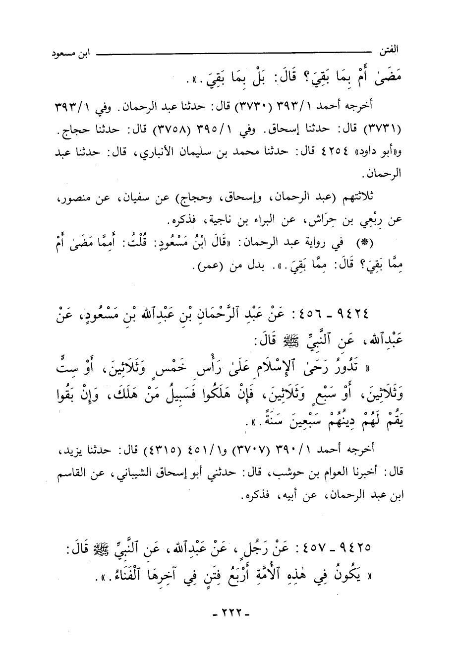 ٩٤٢٤ - عَنْ عَبْدِ الرَّحْمَانِ بْنِ عَبْدِ اللهِ بْنِ مَسْعُودٍ، عَنْ عَبْدِ اللهِ , عَنِ النَّبِيِّ صلى الله عليه وسلم، قَالَ: