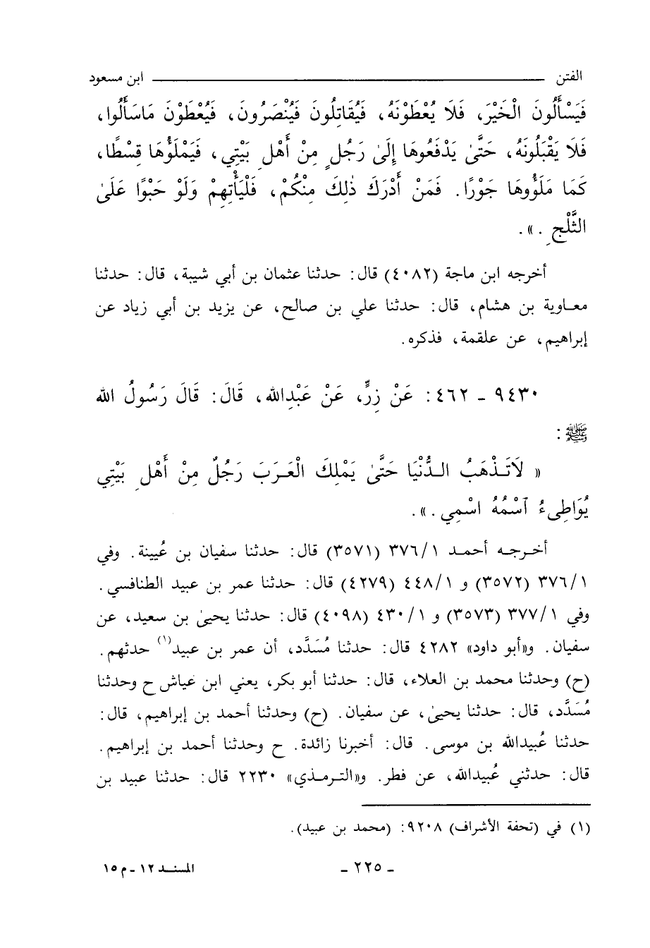 فَيَسْأَلُونَ الْخَيْرَ , فَلَا يُعْطَوْنَهُ , فَيُقَاتِلُونَ , فَيُنْصَرُونَ , فَيُعْطَوْنَ مَا سَأَلُوا , فَلَا يَقْبَلُونَهُ , حَتَّى يَدْفَعُوهَا إِلَى رَجُلٍ مِنْ أَهْلِ بَيْتِي , فَيَمْلَؤُهَا قِسْطًا كَمَا مَلَؤُوهَا جَوْرًا , فَمَنْ أَدْرَكَ ذَلِكَ مِنْكُمْ , فَلْيَأْتِهِمْ وَلَوْ حَبْوًا عَلَى الثَّلْجِ.