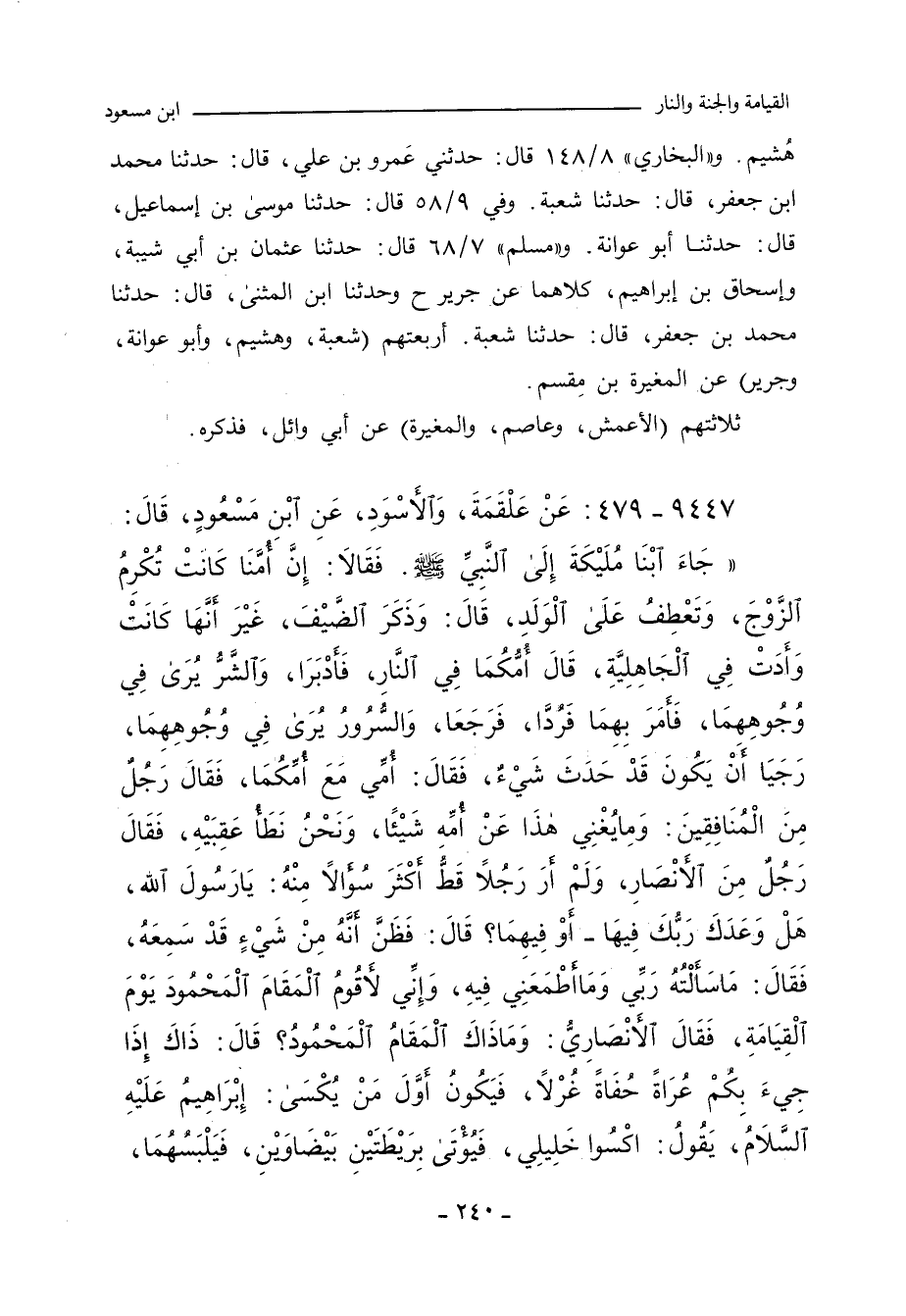 هُشيم، عن المغيرة. و) البُخاري (٨/ ١٤٨ (٦٥٧٥) قال: حدثني يحيى بن حماد، حدَّثنا أبو عوانة، عن سليمان. وفي (٦٥٧٦) قال: وحدثني عَمرو بن علي، حدَّثنا محمد بن جعفر، حدَّثنا شُعبة، عن المغيرة (قال البخاري عقبه: تابعه عاصم). وفي ٩/ ٥٨ (٧٠٤٩) قال: حدَّثنا موسى بن إسماعيل، حدَّثنا أبو عوانة، عن مغيرة. و"مسلم" ٧/ ٦٨ (٦٠٤٣) قال: حدَّثنا أبو بكر بن أبي شيبة، وأبو كريب، وابن نمير، قالوا: حدَّثنا أبو معاوية، عن الأعمش. وفي (٦٠٤٤) قال: وحدَّثناه عثمان بن أبي شيبة، وإسحاق بن إبراهيم، عن جرير، عن الأعمش. وفي (٦٠٤٥) قال: حدَّثنا عثمان بن أبي شيبة، وإسحاق بن إبراهيم، كلاهما عن جرير (ح) وحدَّثنا ابن المثنى، حدَّثنا محمد بن جعفر، حدَّثنا شُعبة، جميعًا عن مغيرة.