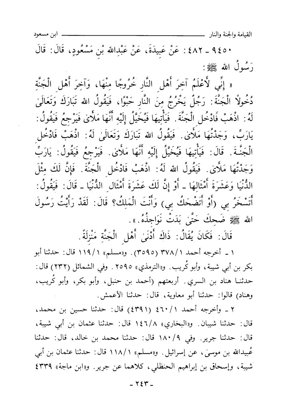 إِنِّي لأَعْلَمُ آخِرَ أَهْلِ النَّارِ خُرُوجًا مِنْهَا، وَآخِرَ أَهْلِ الْجَنَّةِ دُخُولاً الْجَنَّةَ: رَجُلٌ يَخْرُجُ مِنَ النَّارِ حَبْوًا، فَيَقُولُ اللَّهُ , تَبَارَكَ وَتَعَالَى , لَهُ: اذْهَبْ فَادْخُلِ الْجَنَّةَ، فَيَأْتِيهَا، فَيُخَيَّلُ إِلَيْهِ أَنَّهَا مَلأَى، فَيَرْجِعُ فَيَقُولُ: يَا رَبِّ , وَجَدْتُهَا مَلأَى , فَيَقُولُ اللَّهُ، تَبَارَكَ وَتَعَالَى , لَهُ: اذْهَبْ فَادْخُلِ الْجَنَّةَ، قَالَ: فَيَأْتِيهَا، فَيُخَيَّلُ إِلَيْهِ أَنَّهَا مَلأَى، فَيَرْجِعُ، فَيَقُولُ: يَا رَبِّ , وَجَدْتُهَا مَلأَى، فَيَقُولُ اللَّهُ لَهُ: اذْهَبْ فَادْخُلِ الْجَنَّةَ، فَإِنَّ لَكَ مِثْلَ الدُّنْيَا، وَعَشَرَةَ أَمْثَالِهَا، أَوْ إِنَّ لَكَ عَشَرَةَ أَمْثَالِ الدُّنْيَا، قَالَ: فَيَقُولُ: أَتَسْخَرُ بِي، أَوْ أَتَضْحَكُ بِي، وَأَنْتَ الْمَلِكُ؟ قَالَ: لَقَدْ رَأَيْتُ رَسُولَ اللهِ صلى الله عليه وسلم ضَحِكَ حَتَّى بَدَتْ نَوَاجِذُهُ.