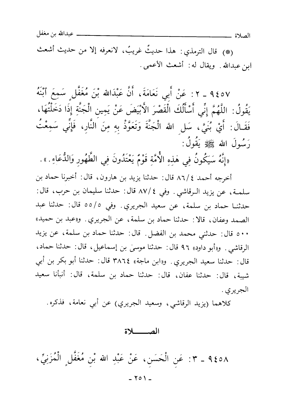 - وفي رواية: أَنَّ عَبْدَ اللهِ بْنَ مُغَفَّلٍ سَمِعَ ابْنًا لَهُ يَقُولُ: اللَّهُمَّ إِنِّي أَسْأَلُكَ الْفِرْدَوْسَ , وَكَذَا , وَأَسْأَلُكَ كَذَا , فَقَالَ: أَيْ بُنَيَّ , سَلِ اللَّهَ الْجَنَّةَ , وَتَعَوَّذْ بِاللهِ مِنَ النَّارِ , فَإِنِّي سَمِعْتُ رَسُولَ اللهِ صلى الله عليه وسلم يَقُولُ: يَكُونُ فِي هَذِهِ الأُمَّةِ قَوْمٌ يَعْتَدُونَ فِي الدُّعَاءِ والطَّهُورِ.