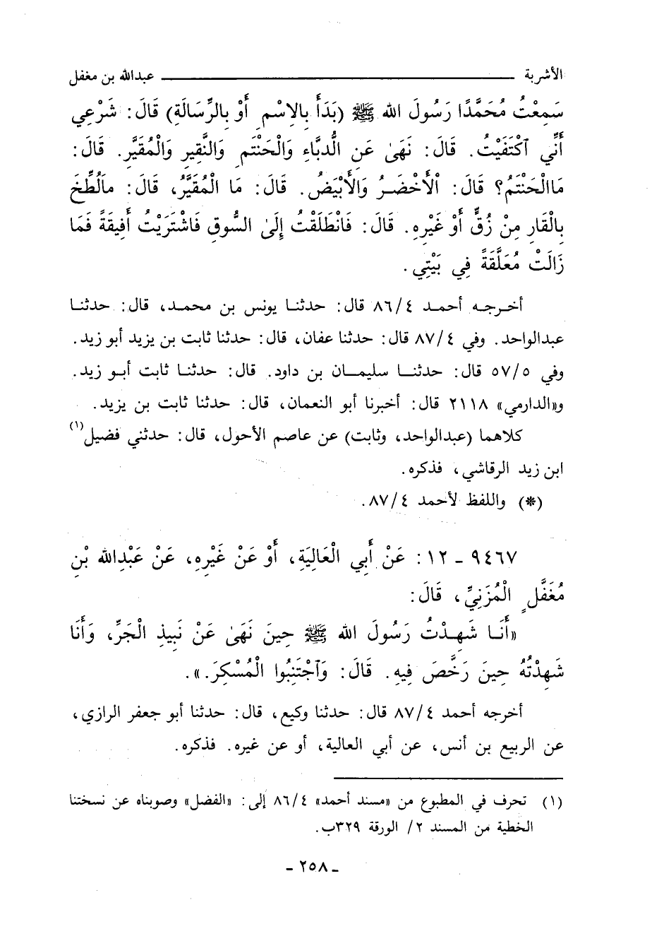 - وفي رواية: عَنْ فُضَيْلِ بْنِ زَيْدٍ الرَّقَاشِيِّ، قَالَ: كُنَّا عِنْدَ عَبْدِ اللهِ بْنِ مُغَفَّلٍ , قَالَ: فَتَذَاكَرْنَا الشَّرَابَ , فَقَالَ: الْخَمْرُ حَرَامٌ , قُلْتُ لَهُ: الْخَمْرُ حَرَامٌ فِي كِتَابِ اللهِ , عَزَّ وَجَلَّ , قَالَ: فَأَيْشٍ تُرِيدُ؟ تُرِيدُ مَا سَمِعْتُ مِنْ رَسُولِ اللهِ صلى الله عليه وسلم؟ سَمِعْتُ رَسُولَ اللهِ صلى الله عليه وسلم يَنْهَى عَنِ الدُّبَّاءِ , وَالْحَنْتَمِ , وَالْمُزَفَّتِ. قَالَ: قُلْتُ: مَا الْحَنْتَمُ؟ قَالَ: كُلُّ خَضْرَاءَ وَبَيْضَاءَ , قَالَ: قُلْتُ: مَا الْمُزَفَّتُ؟ قَالَ: كُلُّ مُقَيَّرٍ مِنْ زِقٍّ , أَوْ غَيْرِهِ.