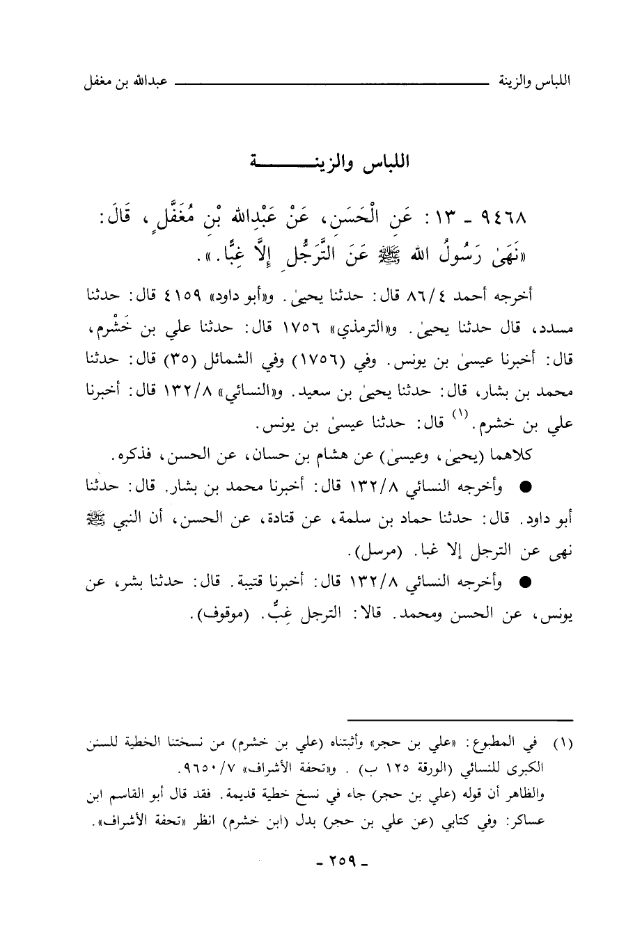 - أخرجه النسائي ٨/ ١٣٢، وفي "الكبرى" ٩٢٦٥ قال: أَخْبَرنا محمد بن بشار , قال: حدَّثنا أبو داود , قال: حدَّثنا حماد بن سلمة، عن قتادة، عن الحسن البصري؛) أَنَّ النَّبِيَّ صلى الله عليه وسلم عَنْ التَّرَجُّلِ إلَا غُبًّا. (مرسل).