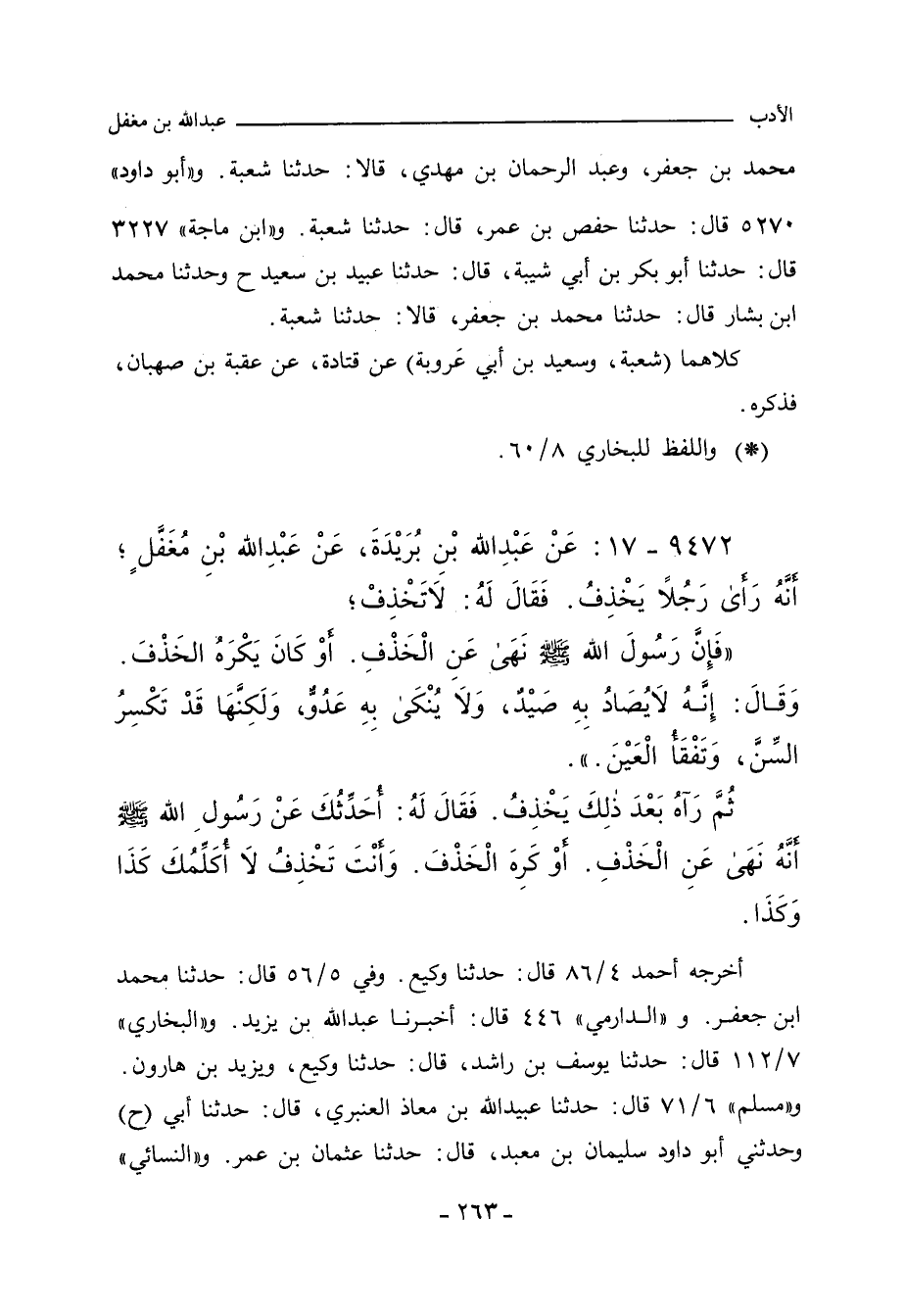 ٩٤٧٢ - عَنْ عَبْدِ اللهِ بْنِ بُرَيْدَةَ، عَنْ عَبْدِ اللهِ بْنِ مُغَفَّلٍ؛ أَنَّةُ رَأَى رَجُلاً يَخْذِفُ، فَقَالَ لَهُ: لَا تَخْذِفْ؛