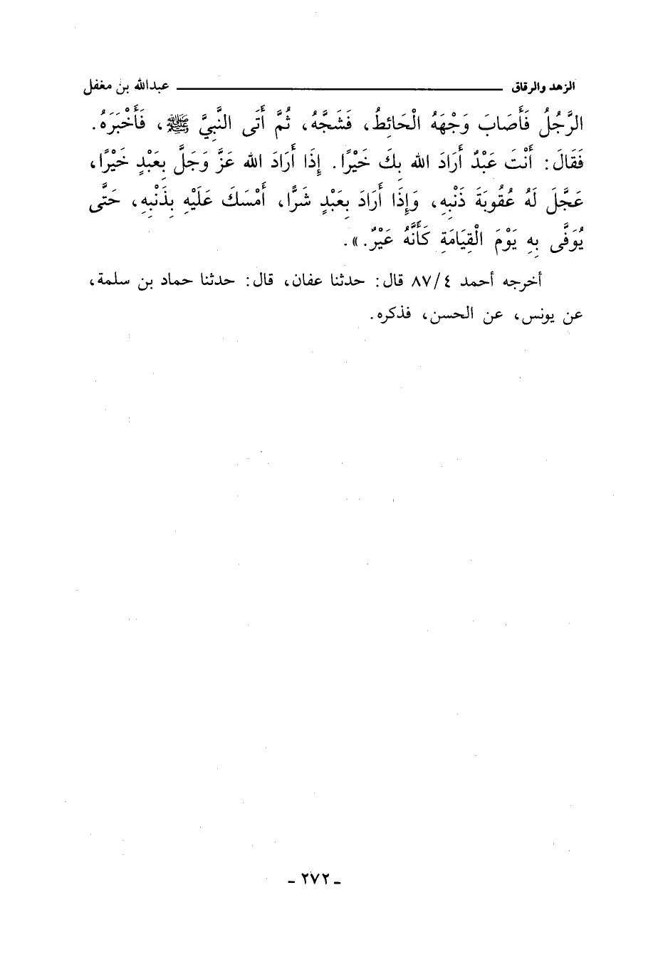 الرَّجُلُ، فَأَصَابَ وَجْهَهُ الْحَائِطُ، فَشَجَّهُ، ثُمَّ أَتَى النَّبِيَّ صلى الله عليه وسلم، فَأَخْبَرَهُ، فَقَالَ: أَنْتَ عَبْدٌ أَرَادَ اللَّهُ بِكَ خَيْرًا، إِذَا أَرَادَ اللَّهُ، عَزَّ وَجَلَّ، بِعَبْدٍ خَيْرًا، عَجَّلَ لَهُ عُقُوبَةَ ذَنْبِهِ، وَإِذَا أَرَادَ بِعَبْدٍ شَرًّا، أَمْسَكَ عَلَيْهِ بِذَنْبِهِ، حَتَّى يُوَافَى بِهِ يَوْمَ الْقِيَامَةِ كَأَنَّهُ عَيْرٌ.