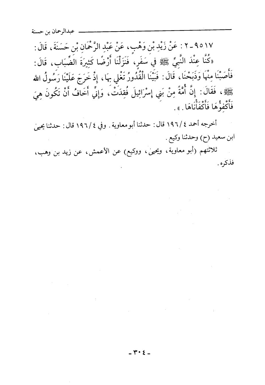 - وفي رواية: غَزَوْنَا مَعَ رَسُولِ اللهِ صلى الله عليه وسلم , فَنَزَلْنَا أَرْضًا كَثِيرَةَ الضِّبَابِ، وَنَحْنُ مُرْمِلُونَ , فَأَصَبْنَاهَا , فَكَانَتِ الْقُدُورُ تَغْلِي بِهَا , فَقَالَ النَّبِيُّ صلى الله عليه وسلم: مَا هَذَا؟ فَقُلْنَا: ضِبَابًا أَصَبْنَاهَا , فَقَالَ: إِنَّ أُمَّةً مِنْ بَنِي إِسْرَائِيلَ مُسِخَتْ , وَأَنَا أَخْشَى أَنْ تَكُونَ هَذِهِ , فَأَمَرَنَا فَأَكْفَأْنَا , وَإِنَّا لَجِيَاعٌ.