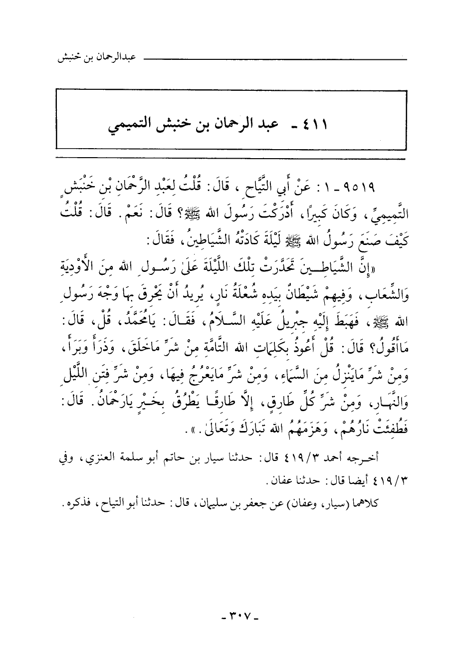 - وفي رواية: عَنْ أَبِي التَّيَّاحِ , قَالَ: سَأَلَ رَجُلٌ عَبْدَ الرَّحْمَانِ بْنَ خَنْبَشٍ: كَيْفَ صَنَعَ رَسُولُ اللهِ صلى الله عليه وسلم حِينَ كَادَتْهُ الشَّيَاطِينُ؟ قَالَ: جَاءَتِ الشَّيَاطِينُ إِلَى رَسُولِ اللهِ صلى الله عليه وسلم مِنَ الأَوْدِيَةِ , وَتَحَدَّرَتْ عَلَيْهِ مِنَ الْجِبَالِ , وَفِيهِمْ شَيْطَانٌ مَعَهُ شُعْلَةٌ مِنْ نَارٍ , يُرِيدُ أَنْ يُحْرِقَ بِهَا رَسُولَ اللهِ صلى الله عليه وسلم , قَالَ: فَرُعِبَ - قَالَ جَعْفَرٌ: أَحْسَبُهُ قَالَ: جَعَلَ يَتَأَخَّرُ - قَالَ: وَجَاءَ جِبْرِيلُ , عَلَيْهِ السَّلَامُ , فَقَالَ: يَا مُحَمَّدُ , قُلْ , قَالَ: مَا أَقُولُ؟ قَالَ: قُلْ: أَعُوذُ بِكَلِمَاتِ اللهِ التَّامَّاتِ , الَّتِي لَا يُجَاوزُهُنَّ بَرٌّ وَلَا فَاجِرٌ , مِنْ شَرِّ مَا خَلَقَ , وَذَرَأَ , وَبَرَأَ , وَمِنْ شَرِّ مَا يَنْزِلُ مِنَ السَّمَاءِ , وَمِنْ شَرِّ مَا يَعْرُجُ فِيهَا , وَمِنْ شَرِّ مَا ذَرَأَ فِي الأَرْضِ , وَمِنْ شَرِّ مَا يَخْرُجُ مِنْهَا , وَمِنْ شَرِّ فِتَنِ اللَّيْلِ وَالنَّهَارِ , وَمِنْ شَرِّ كُلِّ طَارِقٍ , إِلَاّ طَارِقًا يَطْرُقُ بِخَيْرٍ , يَا رَحْمَنُ , فَطُفِئَتْ نَارُ الشَّيَاطِينِ , وَهَزَمَهُمُ اللَّهُ , عَزَّ وَجَلَّ.