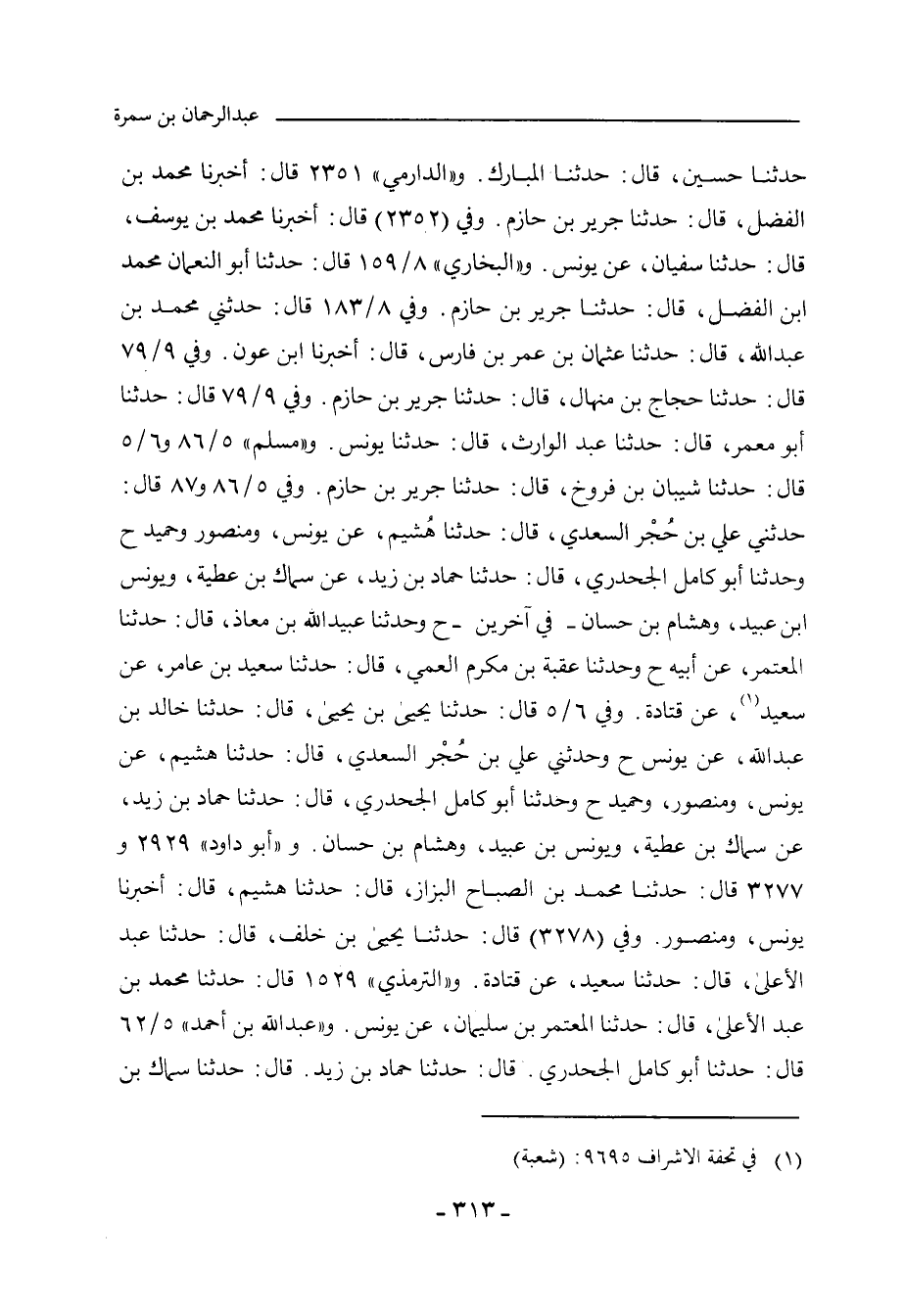حدَّثنا حسين، حدَّثنا المبارك. و"الدارِمِي"٢٣٤٦ قال: أَخْبَرنا محمد بن الفضل، حدَّثنا جرير بن حازم. وفي (٢٣٤٧) قال: أَخْبَرنا محمد بن يوسف، حدَّثنا سفيان، عن يونس. و"البُخَارِي" ٨/ ١٥٩ (٦٦٢٢) قال: حدَّثنا أبو النعمان، محمد بن الفضل، حدَّثنا جرير بن حازم. وفي ٨/ ١٨٣ (٦٧٢٢) قال: حدثني محمد بن عَبْد اللهِ، حدَّثنا عثمان بن عمر بن فارس، أَخْبَرنا ابن عون. وفي ٩/ ٧٩ (٧١٤٦) قال: حدَّثنا حجاج بن منهال، حدَّثنا جرير بن حازم. وفي (٧١٤٧) قال: حدَّثنا أبو مَعْمر، حدَّثنا عبد الوارث، حدَّثنا يونس. و"مسلم" ٥/ ٨٦ (٤٢٩٢) و ٦/ ٥ (٤٧٤٢) قال: حدَّثنا شيبان بن فروخ، حدَّثنا جرير بن حازم. وفي ٥/ ٨٦ (٤٢٩٤) قال: حدثني علي بن حُجْر السعدي، حدَّثنا هُشيم، عن يونس، ومنصور، وحميد (ح) وحدَّثنا أبو كامل الجحدري، حدَّثنا حماد بن زيد، عن سماك بن عطية، ويونس بن عبيد، وهشام بن حسان - في آخرين - (ح) وحدَّثنا عبيد الله بن معاذ، حدَّثنا المعتمر، عن أبيه (ح) وحدَّثنا عقبة بن مكرم العمي، حدَّثنا سعيد بن عامر، عن سعيد، عن قتادة. وفي ٦/ ٥ (٤٧٤٣) قال: حدَّثنا يحيى بن يحيى، حدَّثنا خالد بن عَبْد اللهِ، عن يونس (ح) وحدثني علي بن حُجْر السعدي، حدَّثنا هشيم، عن يونس، ومنصور، وحميد (ح) وحدَّثنا أبو كامل الجحدري، حدَّثنا حماد بن زيد، عن سماك بن عطية، ويونس بن عبيد، وهشام بن حسان.