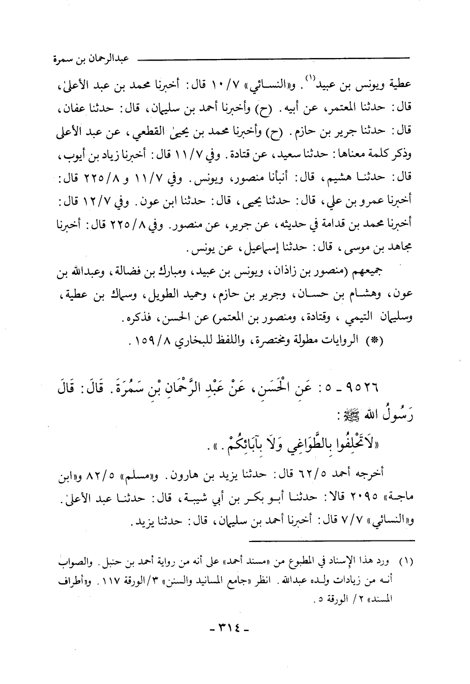 عطية، ويونس بن عبيد. و"النَّسائي" ٧/ ١٠، وفي "الكبرى"٤٧٠٦ قال: أَخْبَرنا محمد بن عبد الأعلى، قال: حدَّثنا المعتمر، عن أبيه. وفي ٧/ ١٠، وفي "الكبرى"٤٧٠٧ قال: أَخْبَرنا أحمد بن سليمان، قال: حدَّثنا عفان، قال: حدَّثنا جرير بن حازم. وفي ٧/ ١٠، وفي "الكبرى"٤٧٠٨ قال: أَخْبَرنا محمد بن يحيى القطعي، عن عبد الأعلى، وذكر كلمة معناها: حدَّثنا سعيد، عن قتادة. وفي ٧/ ١١، وفي "الكبرى"٤٧١٣ قال: أَخْبَرنا زياد بن أيوب، قال: حدَّثنا هشيم، قال: أنبأنا منصور، ويونس. وفي ٧/ ١١ و ٨/ ٢٢٥ قال: أَخْبَرنا عمرو بن علي، قال: حدَّثنا يحيى، قال: حدَّثنا ابن عون. وفي ٧/ ١٢، وفي "الكبرى"٤٧١٤ قال: أَخْبَرنا محمد بن قدامة، في حديثه، عن جرير، عن منصور. وفي ٨/ ٢٢٥، وفي "الكبرى"٨٦٩٢ قال: أَخْبَرنا مجاهد بن موسى، قال: حدَّثنا إسماعيل، عن يونس.