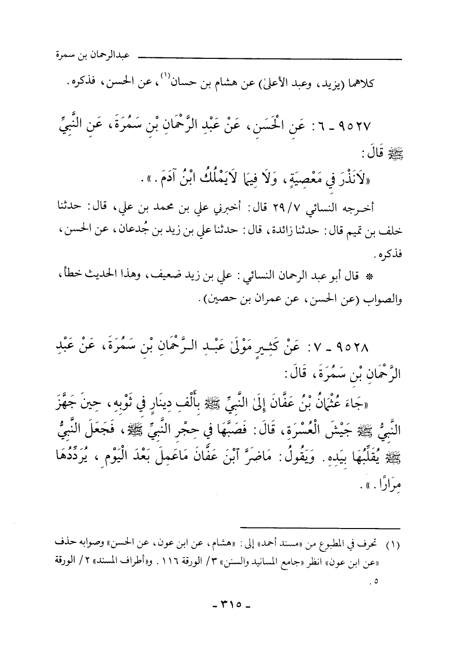 - قال أبو عبد الرحمن النسائي: علي بن زيد ضعيف، وهذا الحديث خطأ، والصواب: عن الحسن، عن عمران بن حصين.