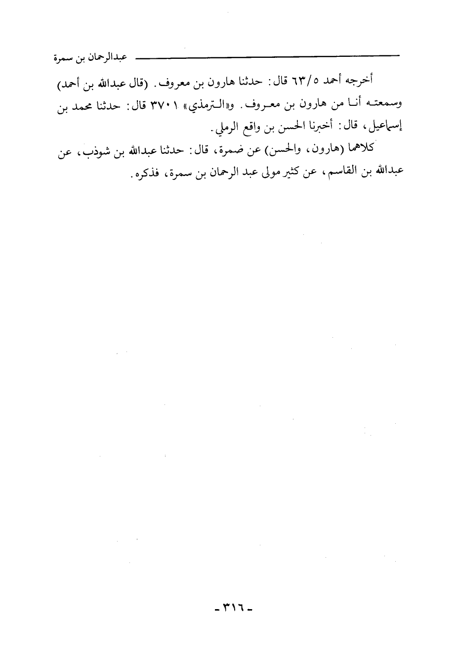كلاهما (هارون، والحسن) عن ضمرة بن ربيعة، حدَّثنا عبد الله بن شوذب، عن عبد الله بن القاسم، عن كثير، مولى عبد الرحمن بن سمرة، فذكره.