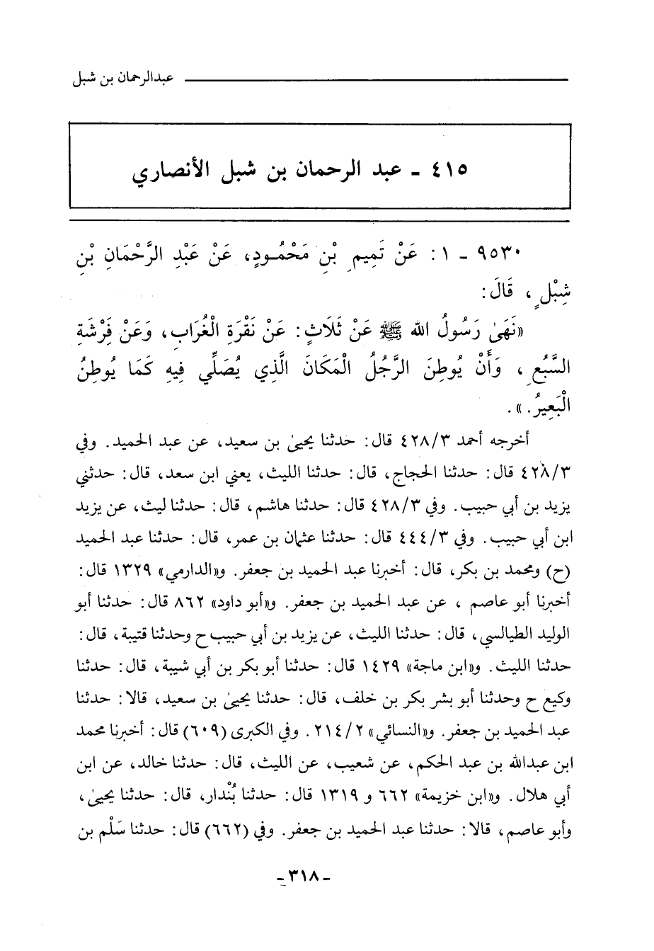 ٩٥٣٠ - عَنْ تَمِيمِ بْنِ مَحْمُودٍ اللَّيْثِيِّ، عَنْ عَبْدِ الرَّحْمَانِ بْن شِبْلٍ الأَنْصَارِيِّ، أَنَّهُ قَالَ: