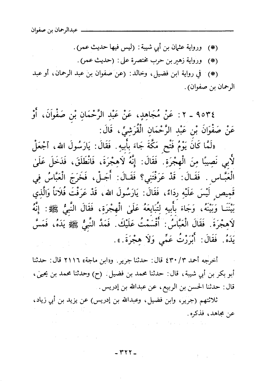 لَمَّا كَانَ يَوْمُ فَتْحِ مَكَّةَ، جَاءَ بِأَبِيهِ، فَقَالَ: يَارَسُولَ اللهِ، اجْعَلْ لأَبِي نَصِيبًا مِنَ الْهِجْرَةِ، فَقَالَ: إِنَّةَ لَا هِجْرَةَ، فَانْطَلَقَ، فَدَخَلَ عَلَى الْعَبَّاسِ، فَقَالَ: قَدْ عَرَفْتَنِي؟ فَقَالَ: أَجَلْ، فَخَرَجَ الْعَبَّاسُ فِي قَمِيصٍ، لَيْسَ عَلَيْهِ رِدَاءٌ، فَقَالَ: يَارَسُولَ اللهِ، قَدْ عَرَفْتَ فُلَانًا، وَالَّذِي بَيْنَنَا وَبَيْنَهُ، وَجَاءَ بِأَبِيهِ لِتُبَايِعَهُ عَلَى الْهِجْرَةِ، فَقَالَ النَّبِيُّ صلى الله عليه وسلم: إِنَّهُ لَا هِجْرَةَ، فَقَالَ الْعَبَّاسُ: أَقْسَمْتُ عَلَيْكَ، فَمَدَّ النَّبِيُّ صلى الله عليه وسلم يَدَهُ، فَمَسَّ يَدَهُ، فَقَالَ: أَبْرَرْتُ عَمِّي، وَلَا هِجْرَةَ.