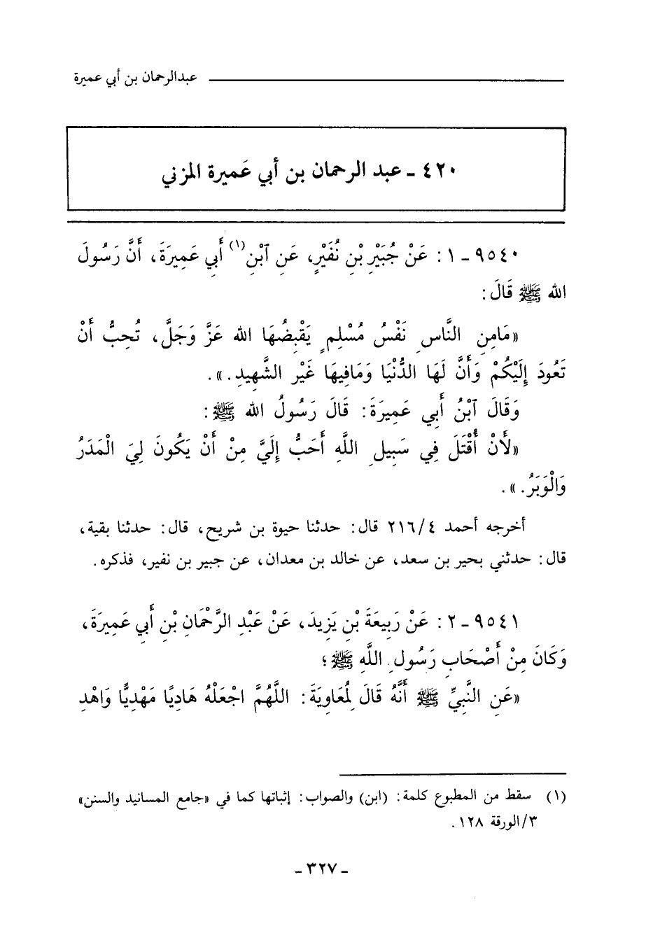 ٩٥٤٠ - عَنْ جُبَيْرِ بْنِ نُفَيْرٍ، عَنِ ابْنِ أَبِي عَمِيرَةَ، أَنَّ رَسُولَ اللهِ صلى الله عليه وسلم قَالَ: