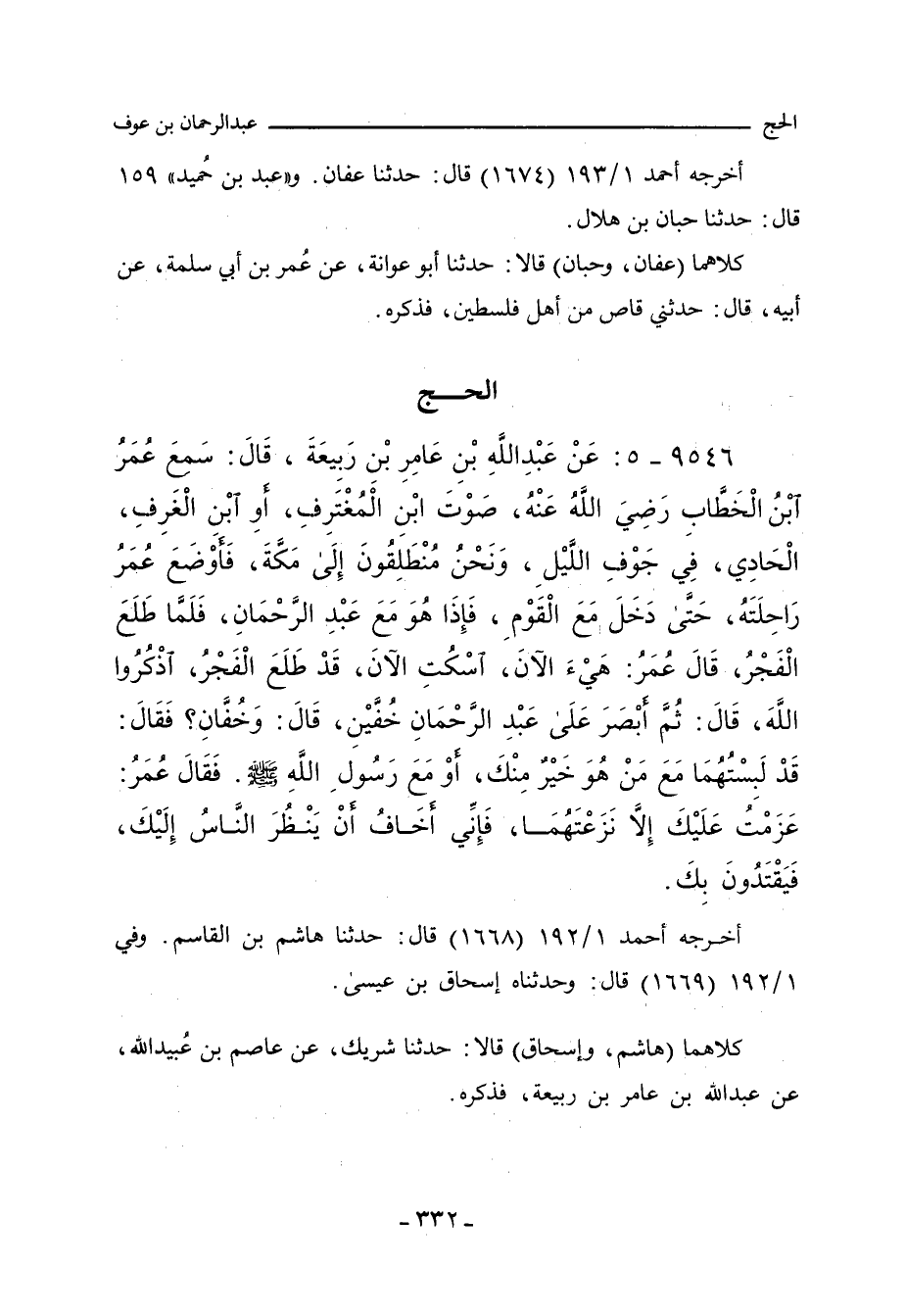 ٩٥٤٦ - عَنْ عَبْدِ اللهِ بْنِ عَامِرِ بْنِ رَبِيعَةَ، قَالَ: سَمِعَ عُمَرُ بْنُ الْخَطَّابِ , رَضِيَ اللَّهُ عَنْهُ، صَوْتَ ابْنِ الْمُغْتَرِفِ , أَوِ ابْنِ الْغَرِفِ , الْحَادِي فِي جَوْفِ اللَّيْلِ , وَنَحْنُ مُنْطَلِقُونَ إِلَى مَكَّةَ , فَأَوْضَعَ عُمَرُ رَاحِلَتَهُ , حَتَّى دَخَلَ مَعَ الْقَوْمِ , فَإِذَا هُوَ مَعَ عَبْدِ الرَّحْمَانِ , فَلَمَّا طَلَعَ الْفَجْرُ قَالَ عُمَرُ: هَيْءَ الآنَ , اسْكُتِ الآنَ , قَدْ طَلَعَ الْفَجْرُ , اذْكُرُوا اللَّهَ , قَالَ: ثُمَّ أَبْصَرَ عَلَى عَبْدِ الرَّحْمَانِ خُفَّيْنِ , قَالَ: وَخُفَّانِ؟! فَقَالَ: قَدْ لَبِسْتُهُمَا مَعَ مَنْ هُوَ خَيْرٌ مِنْكَ , أَوْ مَعَ رَسُولِ اللهِ صلى الله عليه وسلم , فَقَالَ عُمَرُ: عَزَمْتُ عَلَيْكَ إِلَاّ نَزَعْتَهُمَا , فَإِنِّي أَخَافُ أَنْ يَنْظُرَ النَّاسُ إِلَيْكَ , فَيَقْتَدُونَ بِكَ