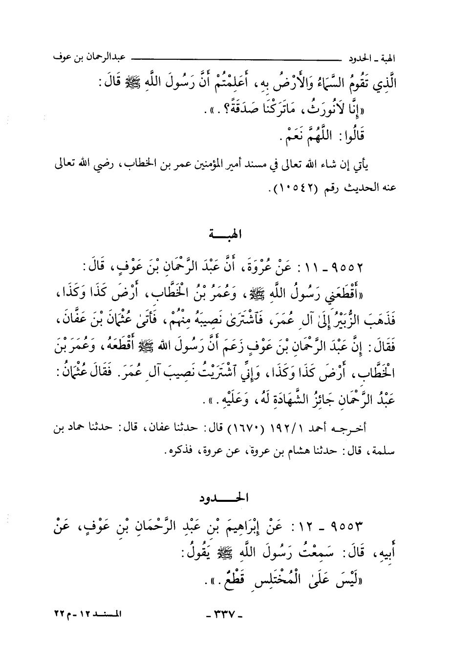 أَقْطَعَنِي رَسُولُ اللهِ صلى الله عليه وسلم، وَعُمَرَ بْنَ الْخَطَّابِ، أَرْضَ كَذَا وَكَذَا، فَذَهَبَ الزُّبَيْرُ إِلَى آلِ عُمَرَ، فَاشْتَرَى نَصِيبَهُ مِنْهُمْ، فَأَتَى عُثْمَانَ بْنَ عَفَّانَ، فَقَالَ: إِنَّ عَبْدَ الرَّحْمَانِ بْنَ عَوْفٍ زَعَمَ , أَنَّ رَسُولَ اللهِ صلى الله عليه وسلم أَقْطَعَهُ، وَعُمَرَ بْنَ الْخَطَّابِ، أَرْضَ كَذَا وَكَذَا، وَإِنِّي اشْتَرَيْتُ نَصِيبَ آلِ عُمَرَ , فَقَالَ عُثْمَانُ: عَبْدُ الرًّحْمَانِ جَائِزُ الشَّهَادَةِ لَهُ، وَعَلَيْهِ.
