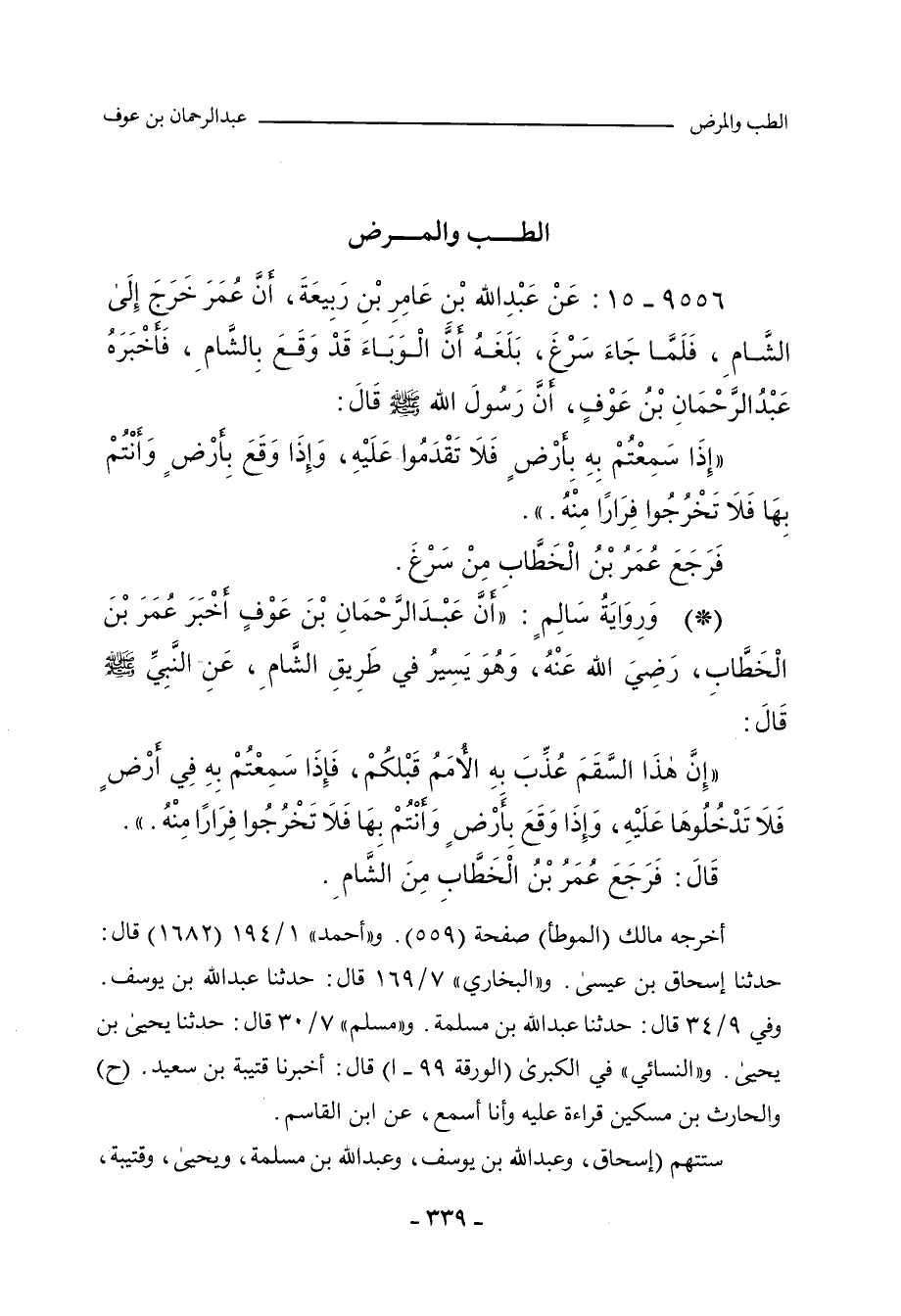 ٩٥٥٦ - عَنْ عَبْدِ اللهِ بْنِ عَامِرِ بْنِ رَبِيعَةَ، أَنَّ عُمَرَ خَرَجَ إِلَى الشَّامِ، فَلَمَّا جَاءَ سَرْغَ، بَلَغَهُ أَنَّ الْوَبَاءَ قَدْ وَقَعَ بِالشَّامِ، فَأَخْبَرَهُ عَبْدُ الرَّحْمَانِ بْنُ عَوْفٍ، أَنَّ رَسُولَ اللهِ صلى الله عليه وسلم قَالَ: