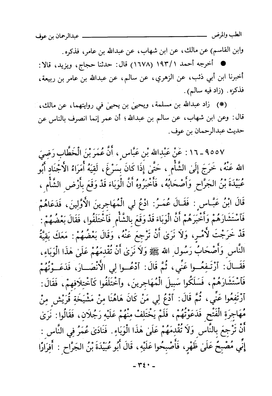 ٩٥٥٧ - عَنْ عَبْدِ اللهِ بْنِ عَبَّاسٍ، أَنَّ عُمَرَ بْنَ الْخَطَّابِ , رَضِيَ اللَّهُ عَنْهُ , خَرَجَ إِلَى الشَّأْمِ , حَتَّى إِذَا كَانَ بِسَرْغَ , لَقِيَهُ أُمَرَاءُ الأَجْنَادِ: أَبُو عُبَيْدَةَ بْنُ الْجَرَّاحِ , وَأَصْحَابُهُ، فَأَخْبَرُوهُ؛ أَنَّ الْوَبَاءَ قَدْ وَقَعَ بِأَرْضِ الشَّأْمِ , قَالَ ابْنُ عَبَّاسٍ: فَقَالَ عُمَرُ: ادْعُ لِيَ الْمُهَاجِرِينَ الأَوَّلِينَ , فَدَعَاهُمْ فَاسْتَشَارَهُمْ , وَأَخْبَرَهُمْ أَنَّ الْوَبَاءَ قَدْ وَقَعَ بِالشَّأْمِ , فَاخْتَلَفُوا , فَقَالَ بَعْضُهُمْ: قَدْ خَرَجْتَ لأَمْرٍ، وَلَا نَرَى أَنْ تَرْجِعَ عَنْهُ , وَقَالَ بَعْضُهُمْ: مَعَكَ بَقِيَّةُ النَّاسِ , وَأَصْحَابُ رَسُولِ اللهِ صلى الله عليه وسلم , وَلَا نَرَى أَنْ تُقْدِمَهُمْ عَلَى هَذَا الْوَبَاءِ , فَقَالَ: ارْتَفِعُوا عَنِّي , ثُمَّ قَالَ: ادْعُوا لِيَ الأَنْصَارَ , فَدَعَوْتُهُمْ فَاسْتَشَارَهُمْ، فَسَلَكُوا سَبِيلَ الْمُهَاجِرِينَ، وَاخْتَلَفُوا كَاخْتِلَافِهِمْ، فَقَالَ: ارْتَفِعُوا عَنِّي , ثُمَّ قَالَ: ادْعُ لِيَ مَنْ كَانَ هَاهُنَا مِنْ مَشْيَخَةِ قُرَيْشٍ , مِنْ مُهَاجِرَةِ الْفَتْحِ , فَدَعَوْتُهُمْ، فَلَمْ يَخْتَلِفْ مِنْهُمْ عَلَيْهِ رَجُلَانِ، فَقَالُوا: نَرَى أَنْ تَرْجِعَ بِالنَّاسِ، وَلَا تُقْدِمَهُمْ عَلَى هَذَا الْوَبَاءِ، فَنَادَى عُمَرُ فِي النَّاسِ: إِنِّي مُصَبِّحٌ عَلَى ظَهْرٍ، فَأَصْبِحُوا عَلَيْهِ، قَالَ أَبُو عُبَيْدَةَ بْنُ الْجَرَّاحِ: أَفِرَارًا
