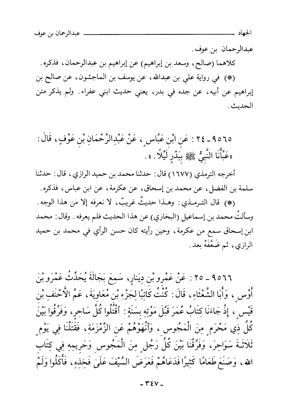 ٩٥٦٥ - عَنِ ابْنِ عَبَّاسٍ، عَنْ عَبْدِ الرَّحْمَانِ بْنِ عَوْفٍ، قَالَ: