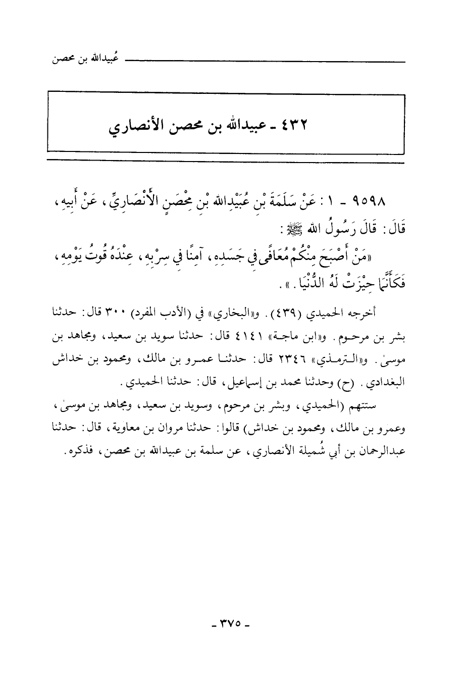 أخرجه الحُمَيدي (٤٣٩). و"البُخَارِي"، في "الأدب المفرد"٣٠٠ قال: حدَّثنا بِشْر بن مَرْحُوم. و"ابن ماجة"٤١٤١ قال: حدَّثنا سُوَيْد بن سَعِيد، ومُجَاهِد بن مُوسَى. و"التِّرمِذي" ٢٣٤٦ قال: حدَّثنا عَمْرو بن مالك، ومحمود ابن خِدَاش البَغْدَادِي (ح) وحدَّثنا مُحَمد بن إِسْماعِيل، حدَّثنا الحُمَيدي.