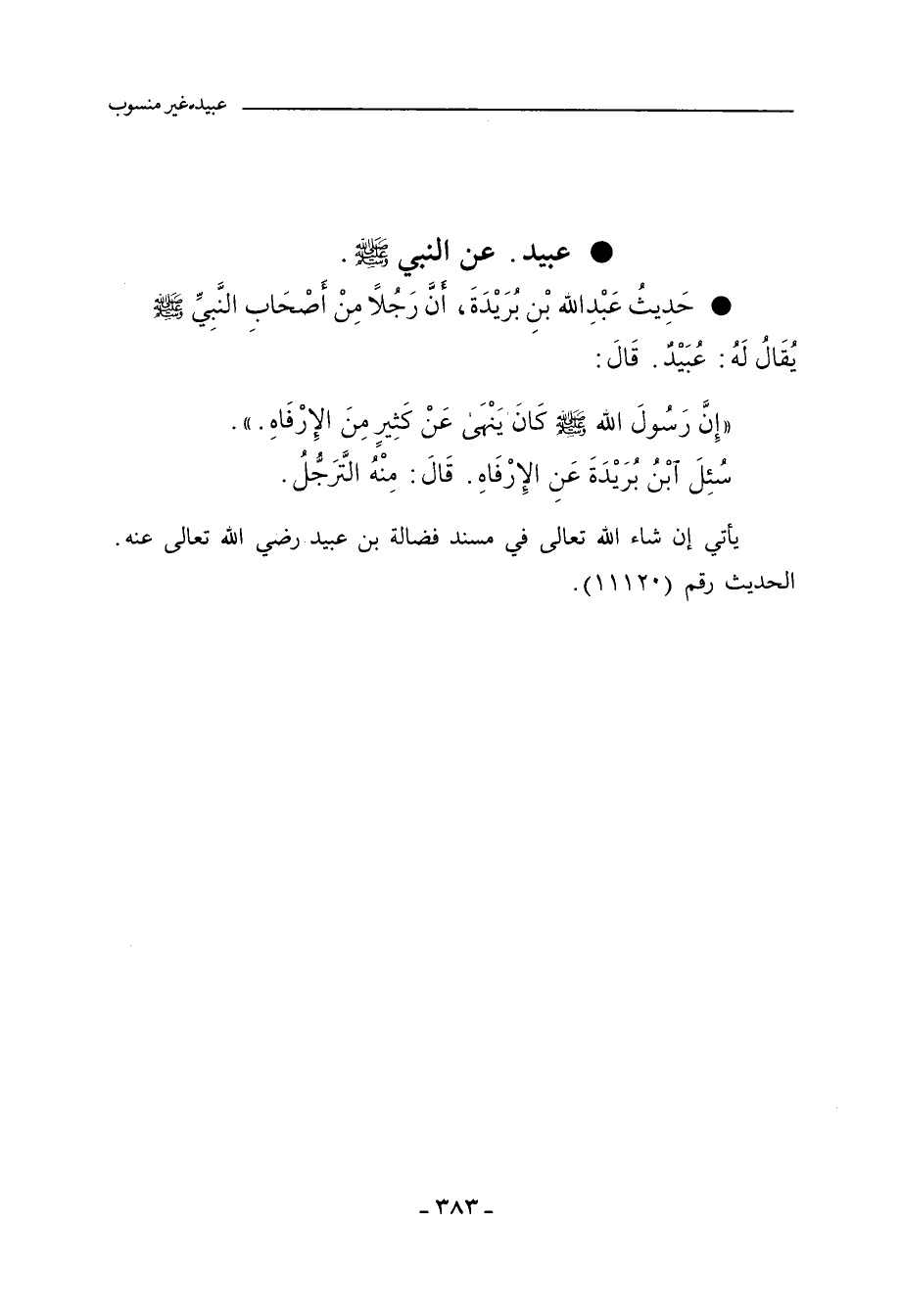 - حَدِيثُ عَبْدِ اللهِ بْنِ بُرَيْدَةَ، أَنَّ رَجُلاً مِنْ أَصْحَابِ النَّبِيِّ صلى الله عليه وسلم، يُقَالُ لَهُ: عُبَيْدٌ، قَالَ: