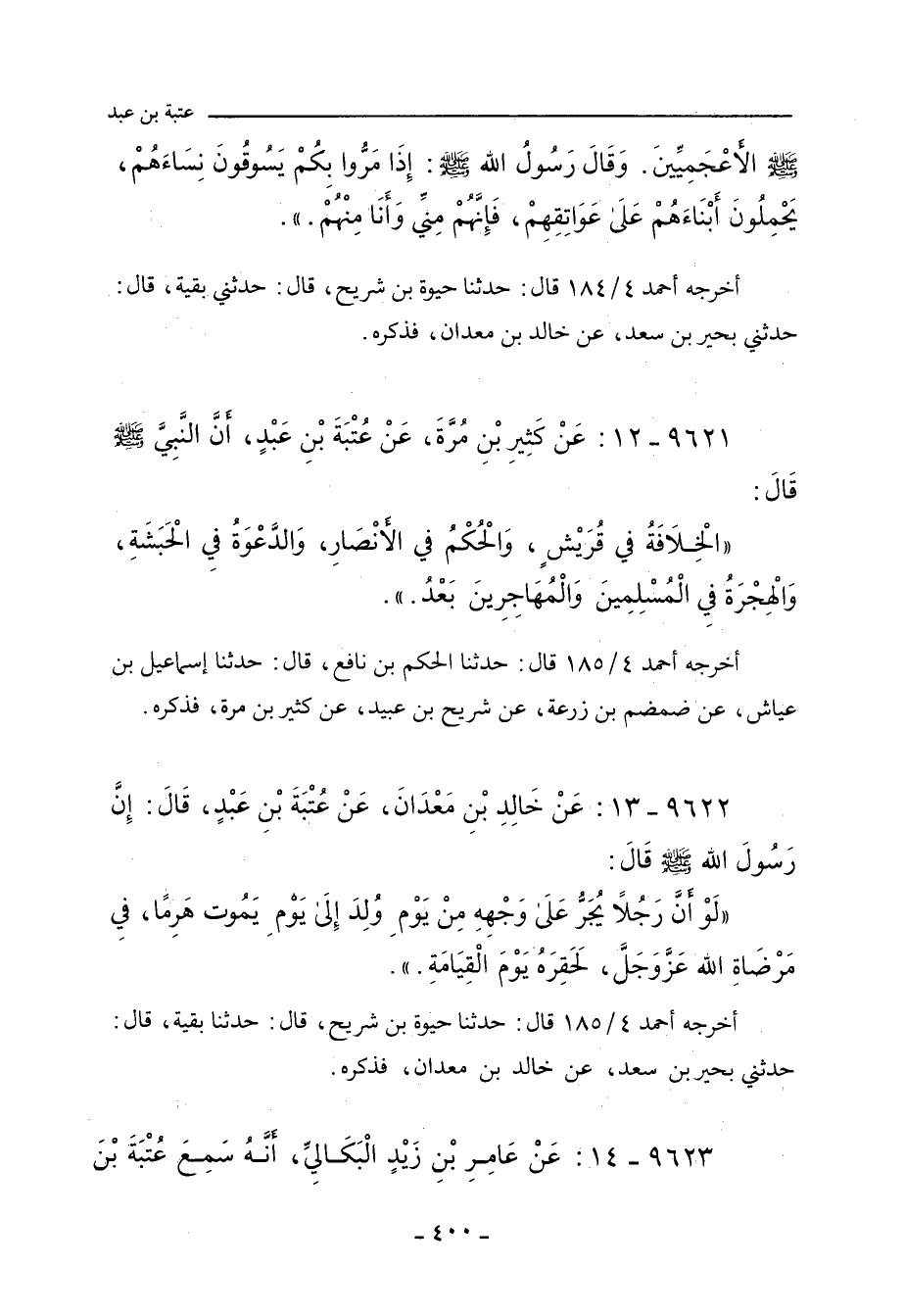٩٦٢١ - عَنْ كَثِيرِ بْنِ مُرَّةَ، عَنْ عُتْبَةَ بْنِ عَبْدٍ، أَنَّ النَّبِيَّ صلى الله عليه وسلم قَالَ: