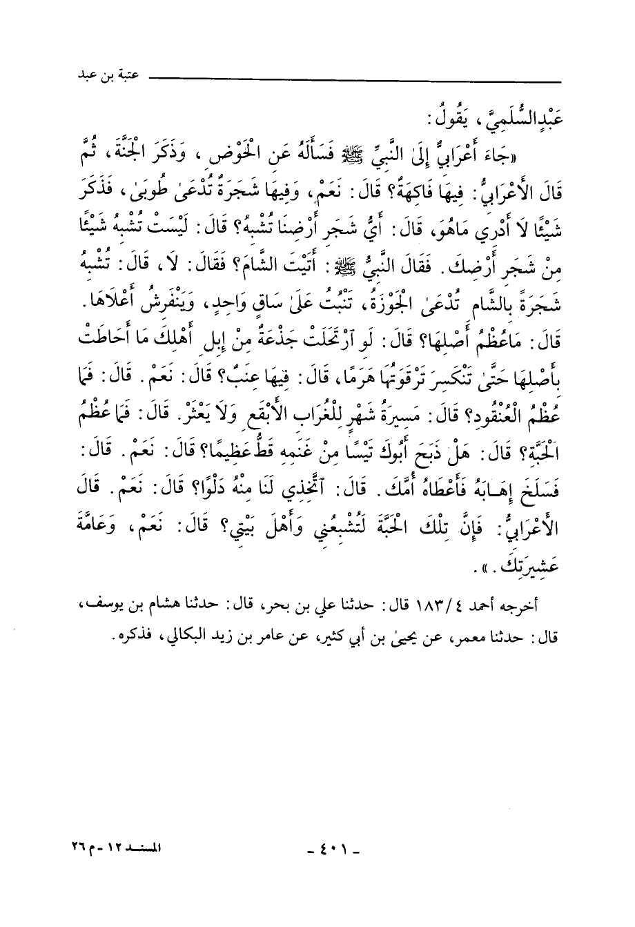 جَاءَ أَعْرَابِيٌّ إِلَى رَسُولِ اللهِ صلى الله عليه وسلم، فسأله عن الحَوْضُ، وذكر الجنة، قال: الأعرابي، أَفِيهَا فَاكِهَةٌ؟ قَالَ: نَعَمْ، إِنَّ فِيهَا شَجَرَةً تُدْعَى طُوبَى، هِيَ تُطَابِقُ الْفِرْدَوْسَ، قَالَ: أَيُّ شَجَرِ أَرْضِنَا تُشْبِهُ؟ قَالَ: لَيْسَ شِبْهُ شَيْءٍ مِنْ شَجَرِ أَرْضِكُمْ، وَلَكِنْ أَتَيْتَ الشَّامَ؟ فَقَالَ: لَا، يَا رَسُولَ اللهِ، قَالَ: فَإِنَّهَا تُشْبِهُ شَجَرَةً بِالشَّامِ، تُدْعَى جَوْزٌ، تَنْبُتُ عَلَى سَاقٍ وَاحِدٍ، وَيَنْتَشِرُ أَعْلَاهاَ، قَالَ: مَا عِظَمُ أَصْلِهَا؟ قَالَ، لَوِ ارْتَحَلْتَ جَذَعَةً مِنْ إِبِلِ أَهْلِكَ مَا أَحَطْتَ بِأَصْلِهَا، حَتَّى تَنْكَسِرَ تَرْقُوَتَاهَا هَرَمًا.