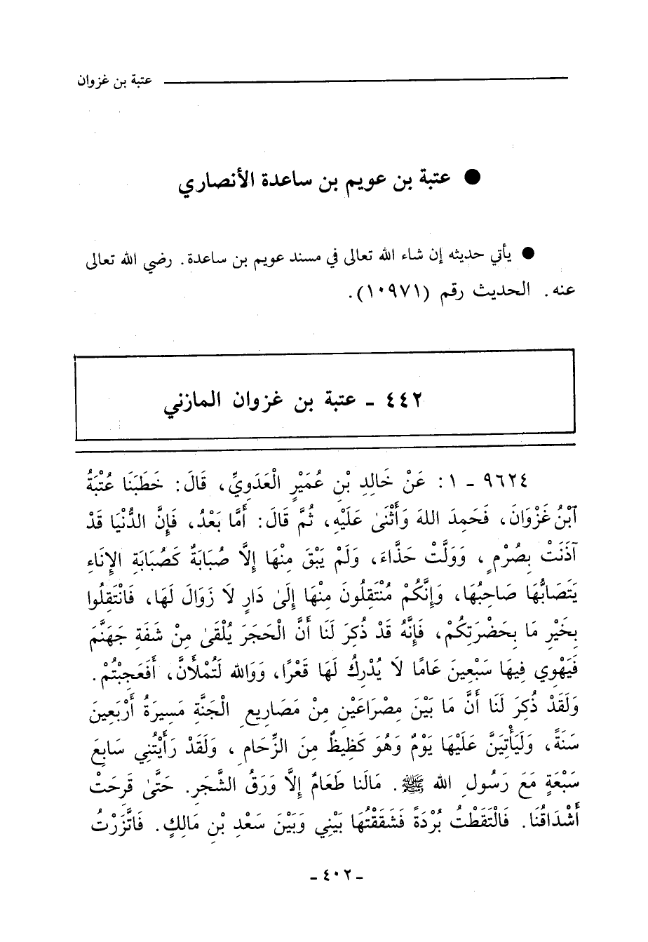 ٩٦٢٤ - عَنْ خَالِدِ بْنِ عُمَيْرٍ الْعَدَويِّ، قَالَ: خَطَبَنَا عُتْبَةُ بْنُ غَزْوَانَ، فَحَمِدَ اللَّهَ وَأَثْنَى عَلَيْهِ، ثُمَّ قَالَ: أَمَّا بَعْدُ، فَإِنَّ الدُّنْيَا قَدْ آذَنَتْ بِصُرْمٍ، وَوَلَّتْ حَذَّاءَ، وَلَمْ يَبْقَ مِنْهَا إِلَاّ صُبَابَةٌ كَصُبَابَةِ الإِنَاءِ، يَتَصَابُّهَا صَاحِبُهَا، وَإِنَّكُمْ مُنْتَقِلُونَ مِنْهَا إِلَى دَارٍ لَا زَوَالَ لَهَا، فَانْتَقِلُوا بِخَيْرِ مَا بِحَضْرَتِكُمْ، فَإِنَّهُ قَدْ ذُكِرَ لَنَا أَنَّ الْحَجَرَ يُلْقَى مِنْ شَفَةِ جَهَنَّمَ، فَيَهْوِي فِيهَا سَبْعِينَ عَامًا، لَا يُدْرِكُ لَهَا قَعْرًا، وَوَاللهِ لَتُمْلأَنَّ، أَفَعَجبْتُمْ، وَلَقَدْ ذُكِرَ لَنَا أَنَّ مَا بَيْنَ مِصْرَاعَيْنِ مِنْ مَصَارِيعِ الْجَنَّةِ مَسِيرَةُ أَرْبَعِينَ سَنَةً، وَلَيَأْتِيَنَّ عَلَيْهَا يَوْمٌ وَهُوَ كَظِيظٌ مِنَ الزِّحَامِ؛
