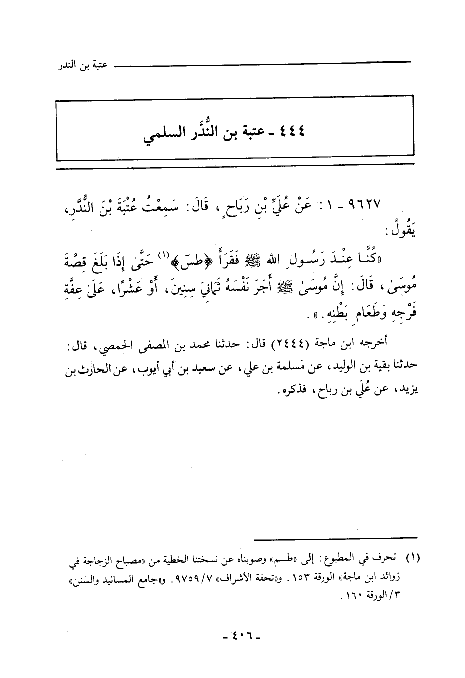 ٩٦٢٧ - عَنْ عُلَيِّ بْنِ رَبَاحٍ، قَالَ: سَمِعْتُ عُتْبَةَ بْنَ النُّدَّرِ، يَقُولُ: