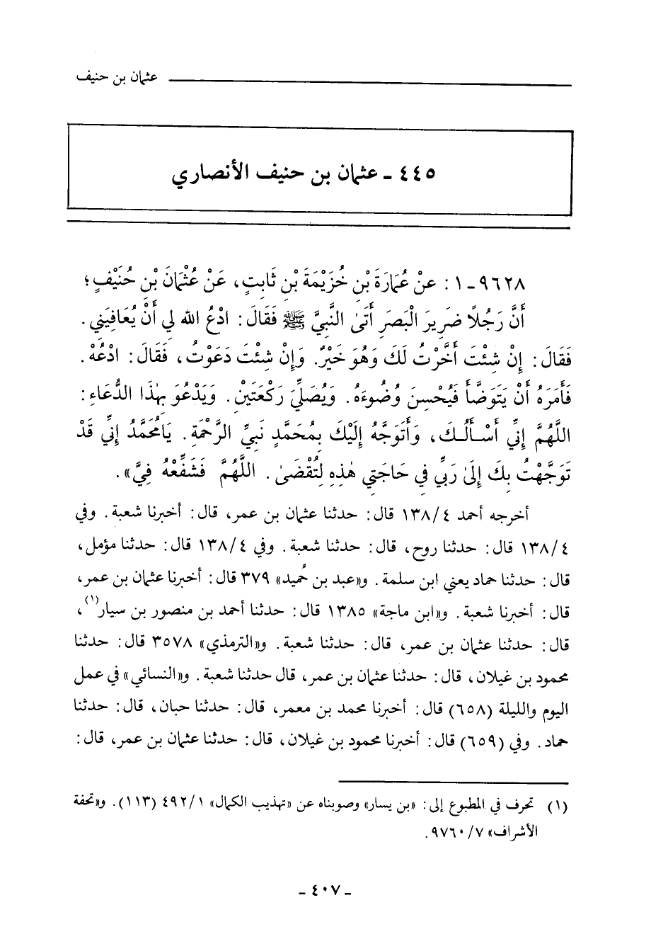 ٩٦٢٨ - عَنْ عُمَارَةَ بْنِ خُزَيْمَةَ بْنِ ثَابِتٍ، عَنْ عُثْمَانَ بْنِ حُنَيْفٍ؛