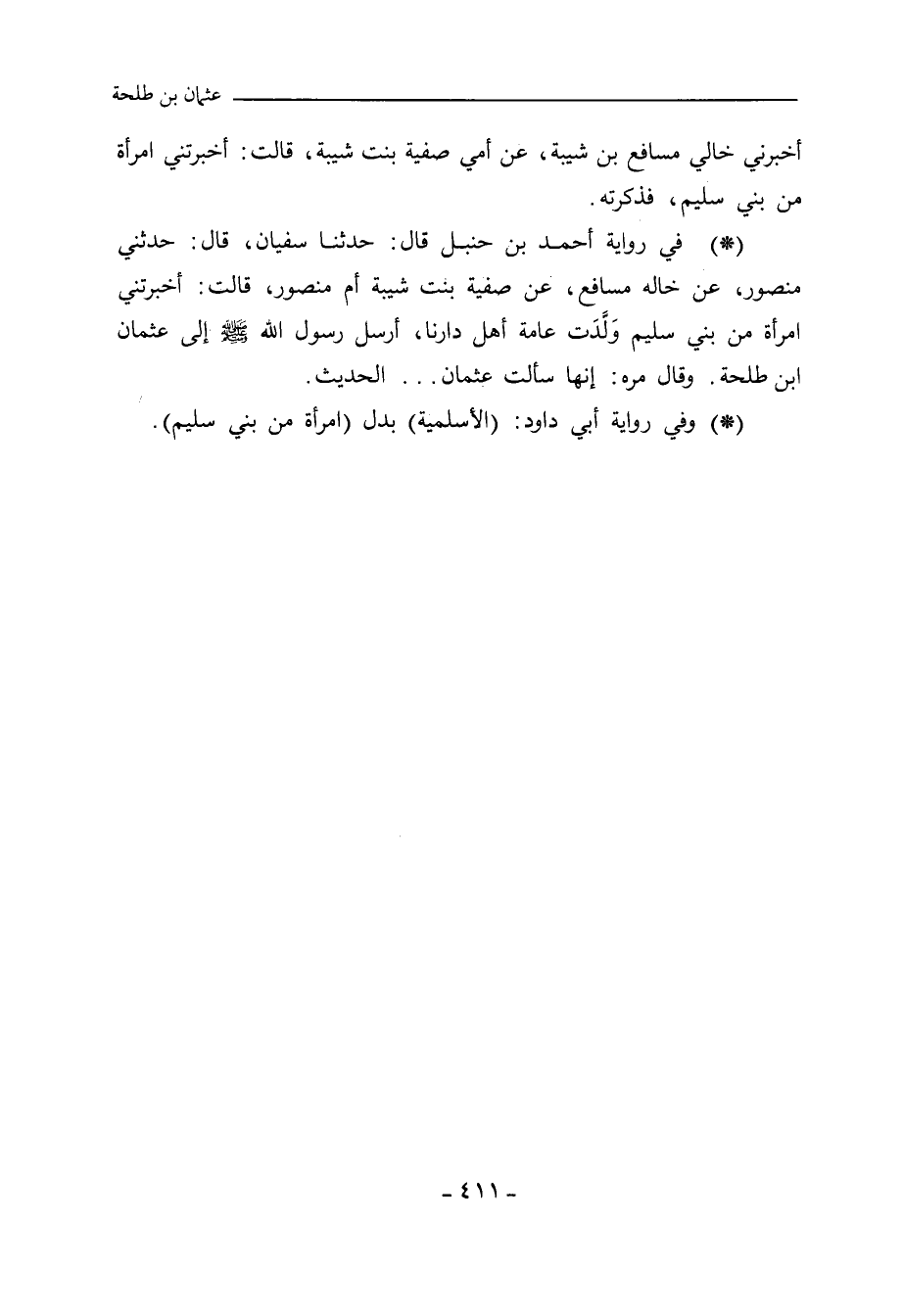 أخبرني خالي مُسَافِع بن شَيْبَة، عن أُمي صَفِيَّة بنت شَيْبَة، قالت: أخبرتني امرأة من بني سُلَيم، فذكرته.