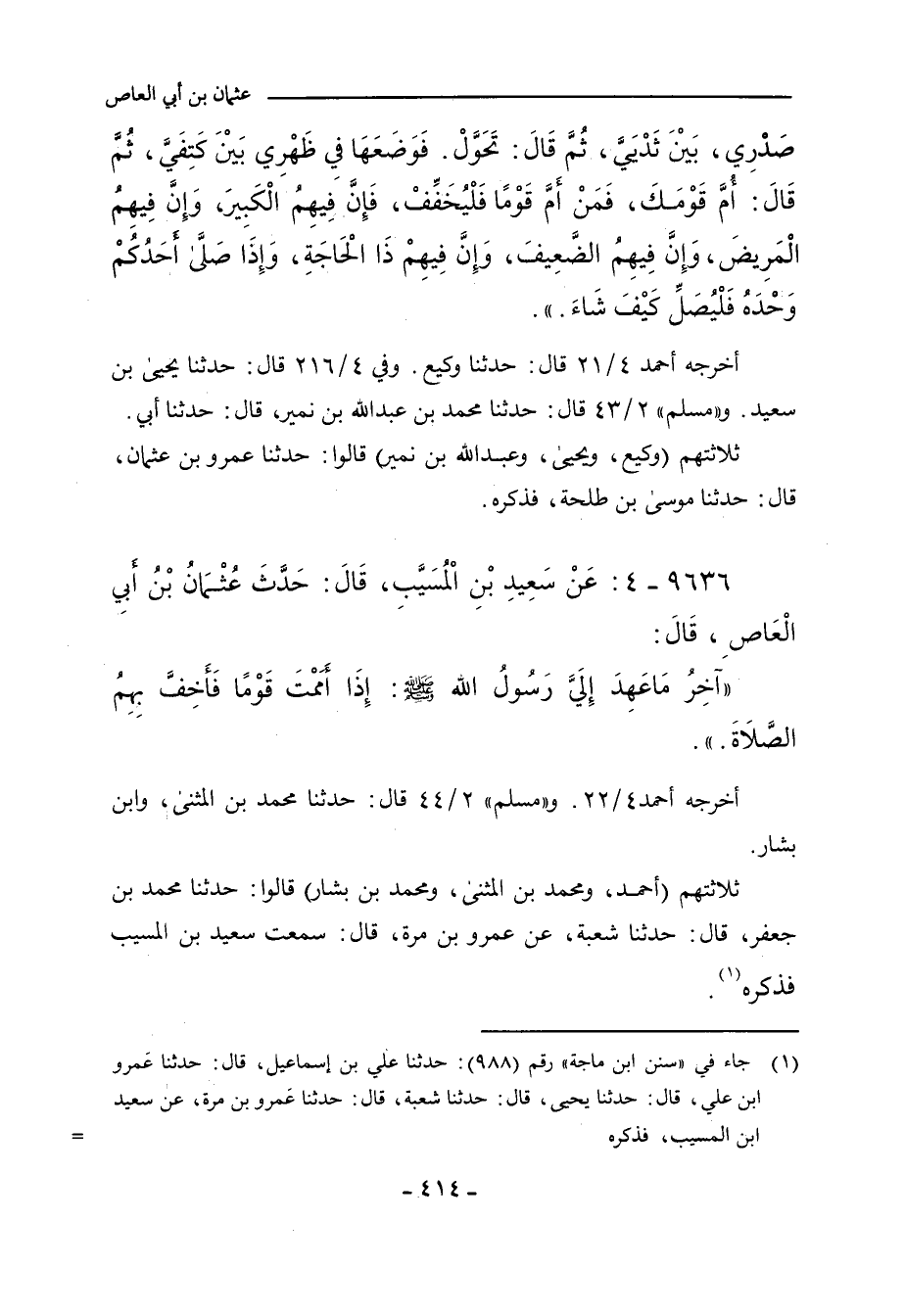 ٩٦٣٦ - عَنْ سَعِيدِ بْنِ الْمُسَيَّبِ، قَالَ: حَدَّثَ عُثْمَانُ بْنُ أَبِي الْعَاصِ، قَالَ: