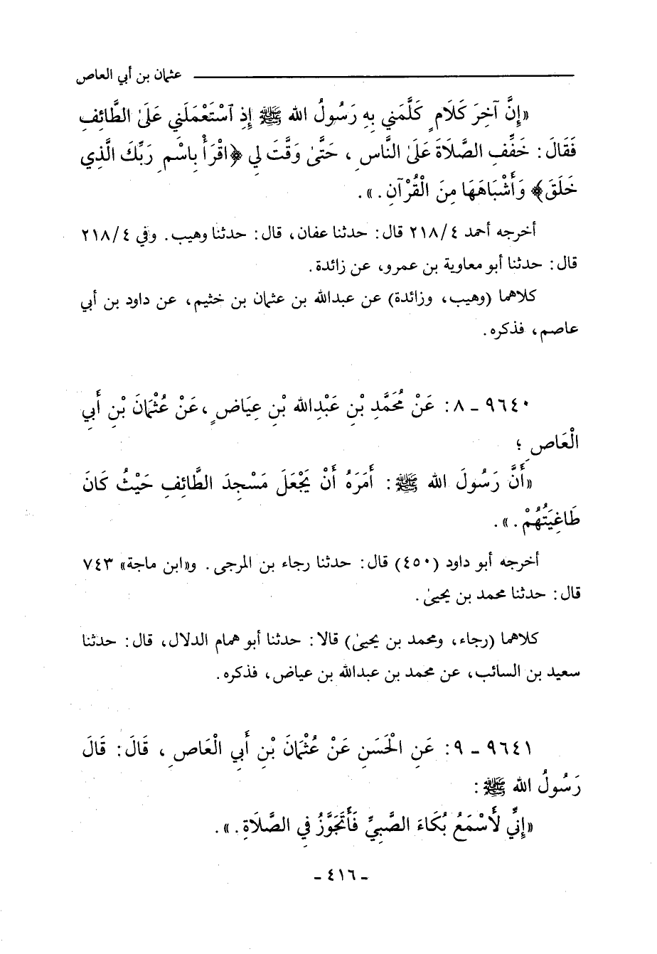٩٦٤٠ - عَنْ مُحَمَّدِ بْنِ عَبْدِ اللهِ بْنِ عِيَاضٍ، عَنْ عُثْمَانَ بْنِ أَبِى الْعَاصِ؛