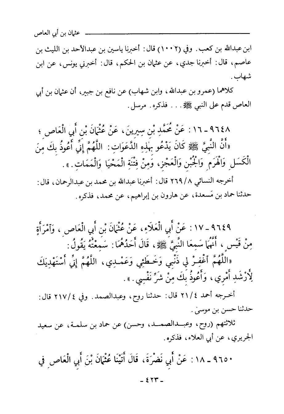 ٩٦٤٨ - عَنْ مُحَمَّدِ بْنِ سِيرِينَ، عَنْ عُثْمَانَ بْنِ أَبِي الْعَاصِ؛