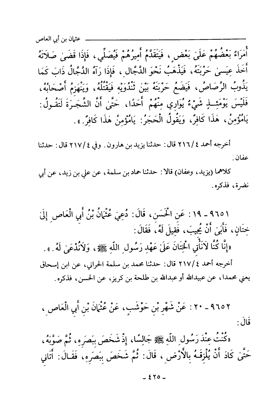 ٩٦٥٢ - عَنْ شَهْرِ بْنِ حَوْشَبٍ، عَنْ عُثْمَانَ بْنِ أَبِي الْعَاصِ، قَالَ:
