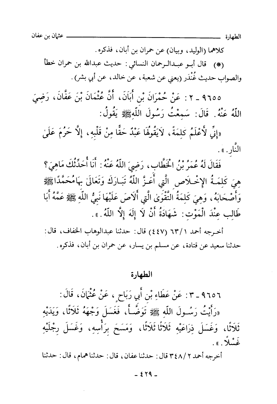 أخرجه أحمد ١/ ٦٣ (٤٤٧) قال: حدَّثنا عَبْد الوهَّاب الخَفَّاف، حدَّثنا سَعِيد , عن قَتَادة، عن مُسْلم بن يَسَار، عن حُمْرَان بن أَبَان، فذكره.