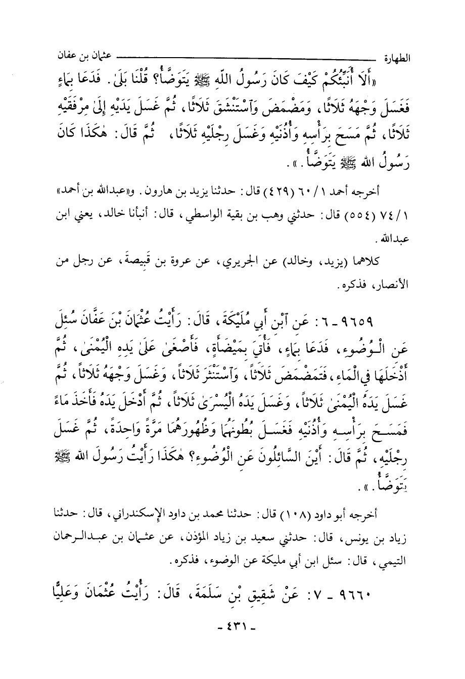 ٩٦٥٩ - عَنِ ابْنِ أَبِي مُلَيْكَةَ، قَالَ: رَأَيْتُ عُثْمَانَ بْنَ عَفَّانَ سُئِلَ عَنِ الْوُضُوءِ،