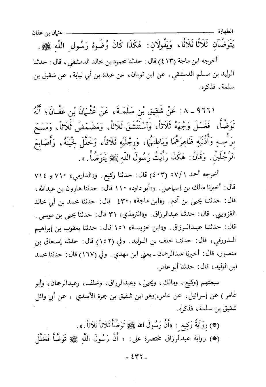 أخرجه أحمد ١/ ٥٧ (٤٠٣) قال: حدَّثنا وَكِيع. و"عَبد بن حُميد"٦٢ قال: حدَّثني ابن أَبي شَيْبَة، قال: حدَّثنا عَبْد الله بن نُمَيْر. و"الدارِمِي" ٧٠٤ و ٧٠٨ قال: أَخْبَرنا مالك بن إِسْماعِيل. و"أبو داود"١١٠ قال: حدَّثنا هارون بن عَبْد الله، حدَّثنا يَحيى بن آدم. و"ابن ماجة"٤٣٠ قال: حدَّثنا مُحَمد بن أَبي خالد القَزْوِينِي، حدَّثنا عَبْد الرَّزَّاق. و"التِّرمِذي"٣١ قال: حدَّثنا يَحيى ابن مُوسَى، حدَّثنا عَبْد الرَّزَّاق. و"ابن خزيمة"١٥١ قال: حدَّثنا يَعْقُوب بن إبراهيم الدَّوْرَقِي، حدَّثنا خَلَف بن الوَلِيد. وفي (١٥٢) قال: حدَّثنا إِسْحاق بن مَنْصُور، أَخْبَرنا عَبْد الرَّحْمان، يعني ابن مَهْدي. وفي (١٦٧) قال: حدَّثنا مُحَمد بن الوَلِيد، حدَّثنا أبو عامر.