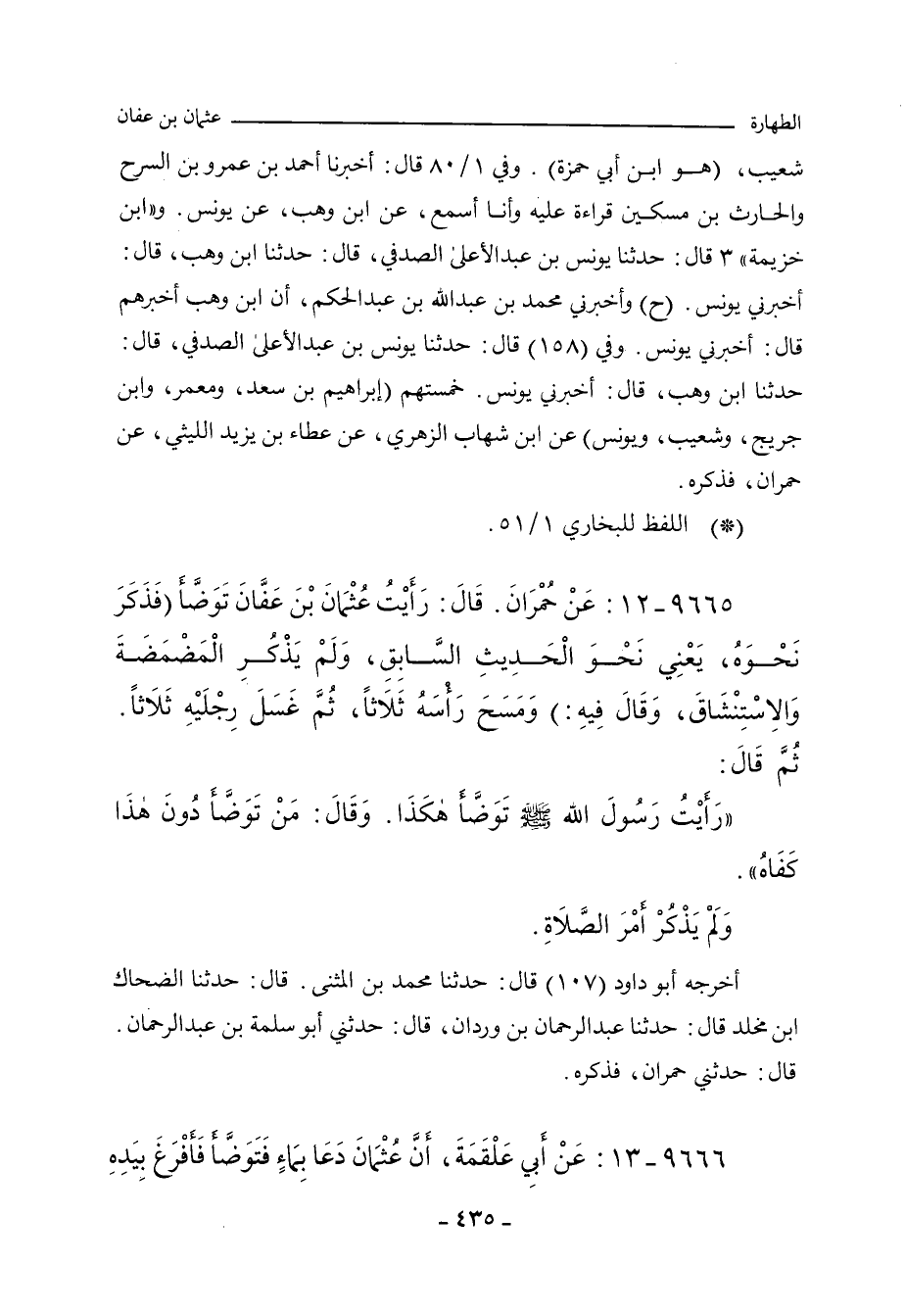 أخرجه أبو داود (١٠٧) قال: حدَّثنا مُحَمد بن المُثَنَّى، حدَّثنا الضَّحَّاك بن مَخْلَد، حدَّثنا عَبْد الرَّحْمان بن وَرْدَان، حدَّثني أبو سَلَمة بن عَبْد الرَّحْمان، حدَّثني حُمْرَانُ، فذكره