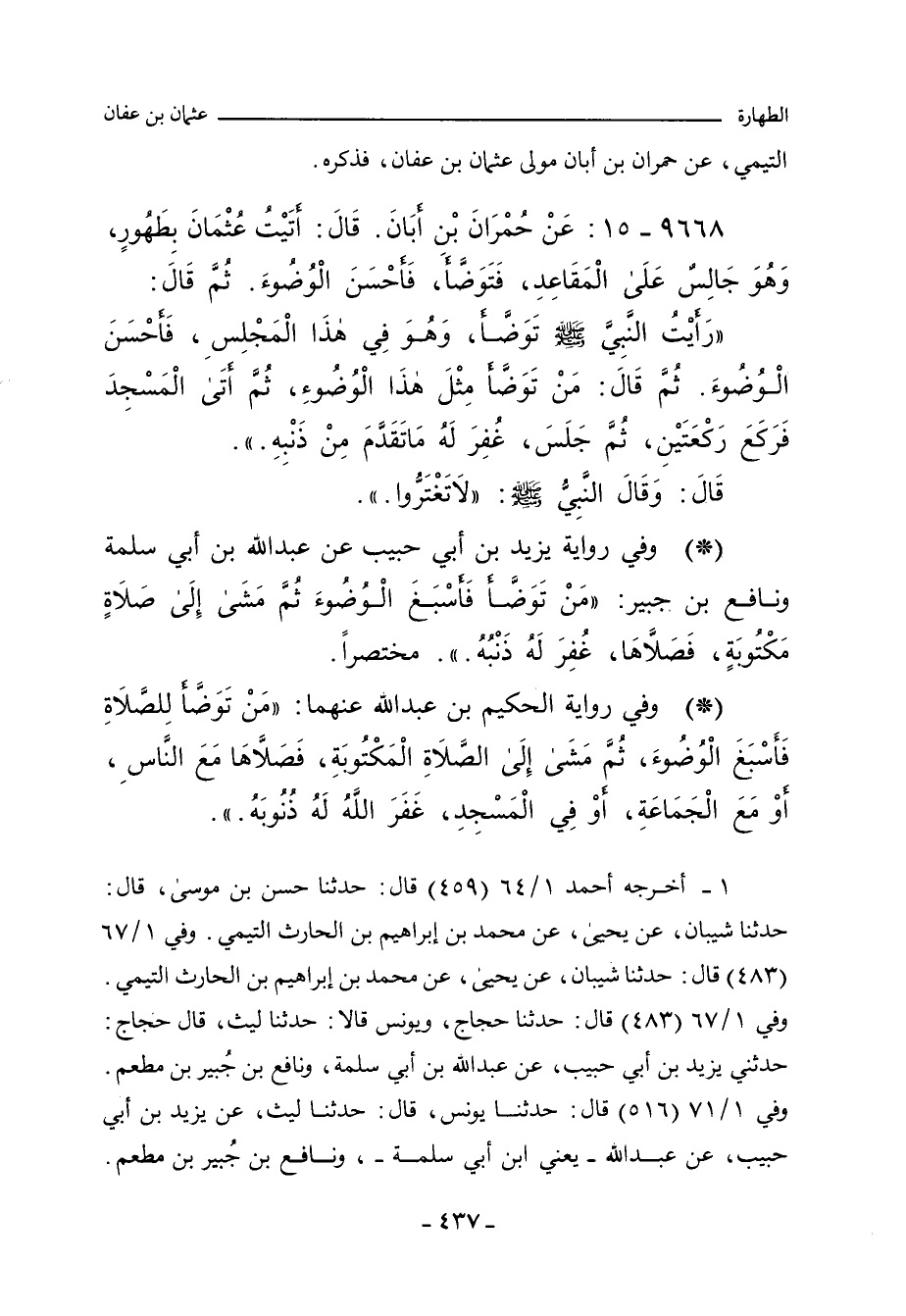 - وفي رواية: رَأَيْتُ عُثْمَانَ بْنَ عَفَّانَ قَاعِدًا فِي الْمَقَاعِدِ، فَدَعَا بِوَضُوءٍ فَتَوَضَّأَ، ثُمَّ قَالَ: رَأَيْتُ رَسُولَ اللهِ صلى الله عليه وسلم فِي مَقْعَدِي هَذَا، تَوَضَّأَ مِثْلَ وُضُوئِي هَذَا، ثُمَّ قَالَ: مَنْ تَوَضَّأَ مِثْلَ وُضُوئِي هَذَا، غُفِرَ لَهُ مَا تَقَدَّمَ مِنْ ذَنْبِهِ.