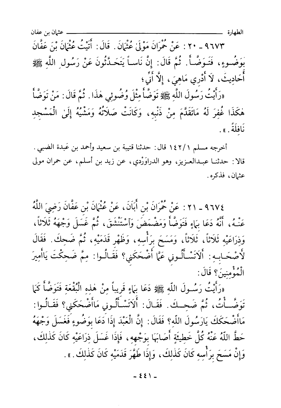 أخرجه مُسْلم ١/ ١٤٢ (٤٦٤) قال: حدَّثنا قُتَيْبة بن سَعِيد، وأحمد بن عَبْدة الضَّبِّي، قالا: حدَّثنا عَبْد العَزِيز، وهو الدَّرَاوَرْدِي، عن زَيْد بن أَسْلم، عن حُمْرَان مَوْلَى عُثْمان، فذكره.
