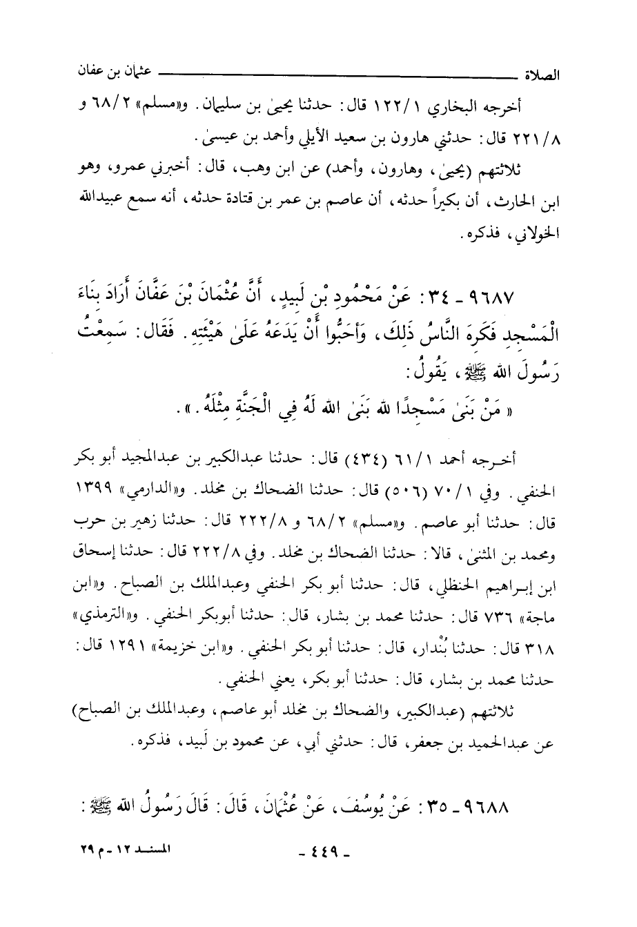 ٩٦٨٧ - عَنْ مَحْمُودِ بْن لَبِيدٍ، أَنَّ عُثْمَانَ بْنَ عَفَانَ أَرَادَ بِنَاءَ الْمَسْجِدِ، فَكَرِهَ النَّاسُ ذَلِكَ، وَأَحَبُّوا أَنْ يَدَعَهُ عَلَى هَيْئَتِهِ، فَقَالَ: سَمِعْتُ رَسُولَ اللهِ صلى الله عليه وسلم يَقُولُ: