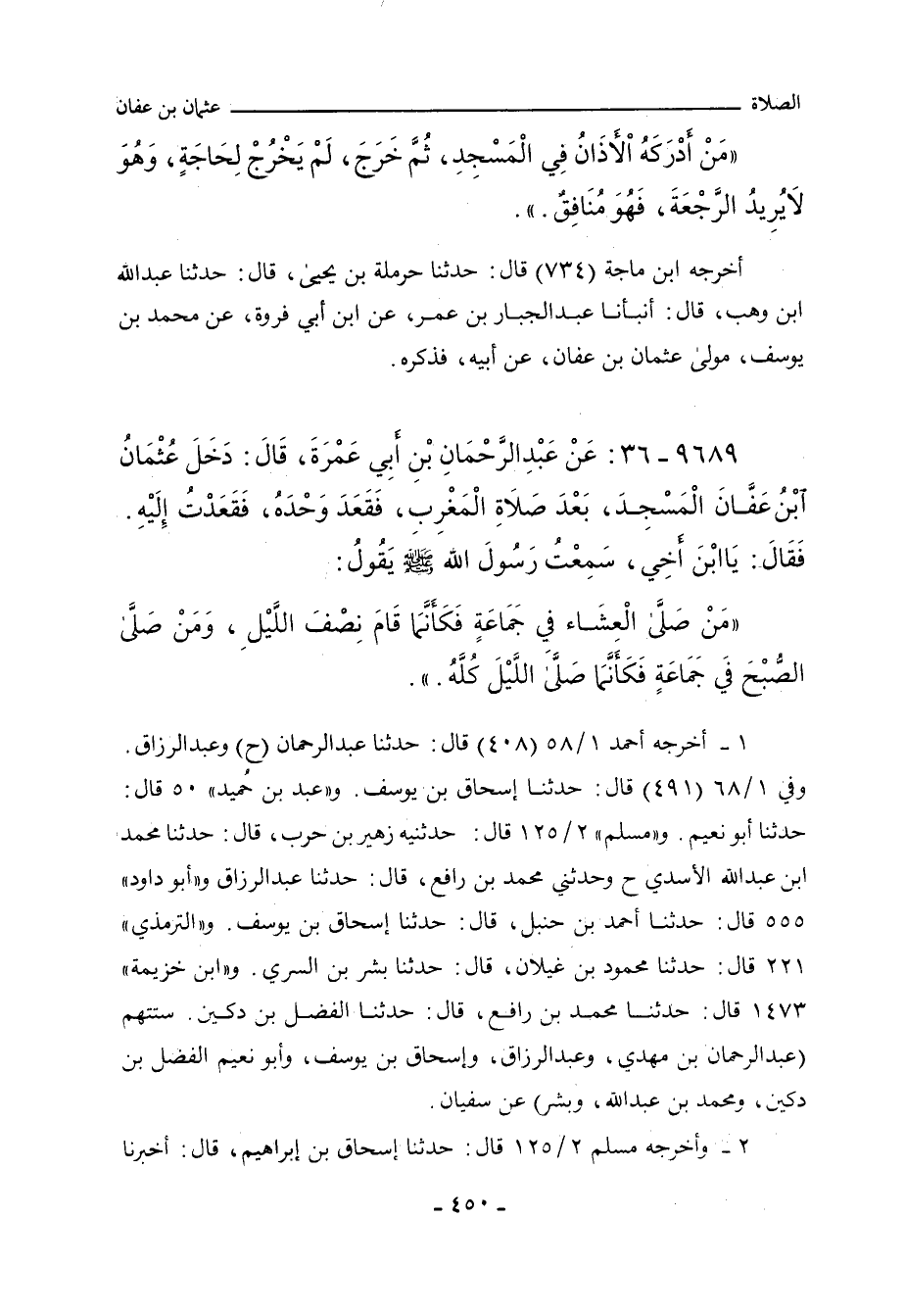 ٩٦٨٩ - عَنْ عَبْدِ الرَّحْمَانِ بْنِ أَبِي عَمْرَةَ، قَالَ: دَخَلَ عُثْمَانُ بْنُ عَفَّانَ الْمَسْجِدَ، بَعْدَ صَلَاةِ الْمَغْرِبِ، فَقَعَدَ وَحْدَهُ، فَقَعَدْتُ إِلَيْهِ، فَقَالَ: يَا ابْنَ أَخِي، سَمِعْتُ رَسُولَ اللهِ صلى الله عليه وسلم يَقُولُ: