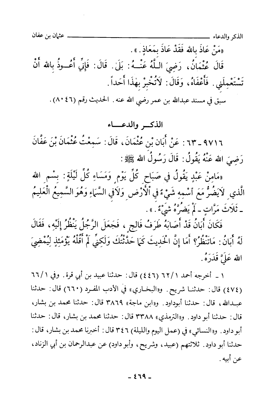 ١ - أخرجه أحمد ١/ ٦٢ (٤٤٦) قال: حدَّثنا عُبَيْد بن أَبي قُرَّة. وفي ١/ ٦٦ (٤٧٤) قال: حدَّثنا سُرَيْج. و"البُخَارِي"، في "الأدب المفرد"٦٦٠ قال: حدَّثنا عَبْد الله، قال: حدَّثنا أبو داود. و"ابن ماجة"٣٨٦٩ قال: حدَّثنا مُحَمد بن بَشَّار، حدَّثنا أبو داود. و"التِّرمِذي"٣٣٨٨ قال: حدَّثنا مُحَمد بن بَشَّار، حدَّثنا أبو داود. و"النَّسائي"، في "عمل اليوم والليلة"٣٤٦ قال: أَخْبَرنا مُحَمد بن بَشَّار، قال: حدَّثنا أبو داود. ثلاثتهم (عُبَيْد، وسُرَيْج، وأبو داود) عن عَبْد الرَّحْمان بن أَبي الزِّنَاد , عن أييه.