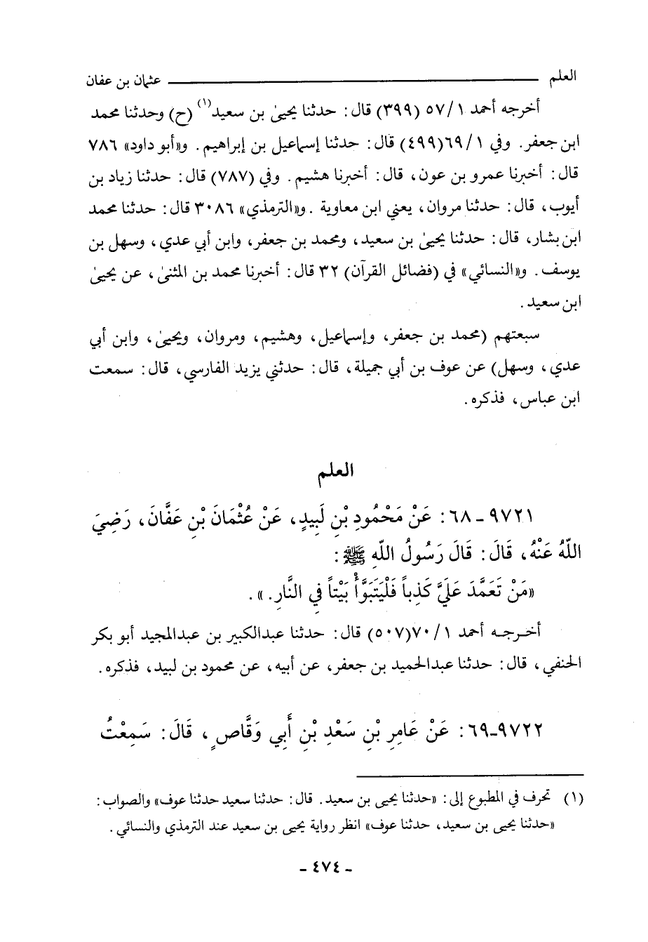أخرجه أحمد ١/ ٥٧ (٣٩٩) قال: حدَّثنا يَحيى بن سَعِيد (ح) وحدَّثنا مُحَمد بن جَعْفر. وفي ١/ ٦٩ (٤٩٩) قال: حدَّثنا إِسْماعِيل ابن إبراهيم. و"أبو داود"٧٨٦ قال: أَخْبَرنا عَمْرو بن عَوْن، أَخْبَرنا هُشَيْم. وفي (٧٨٧) قال: حدَّثنا زِيَاد بن أَيُّوب، حدَّثنا مَرْوَان، يعني ابن مُعَاوية. و"التِّرمِذي"٣٠٨٦ قال: حدَّثنا مُحَمد بن بَشَّار، حدَّثنا يَحيى بن سَعِيد، ومُحَمد بن جَعْفر، وابن أَبي عَدِي، وسَهْل بن يُوسُف. و"النَّسَائي" في "الكبرى"٧٩٥٣ قال: أَخْبَرنا مُحَمد بن المُثَنَّى، عن يَحيى بن سَعِيد.