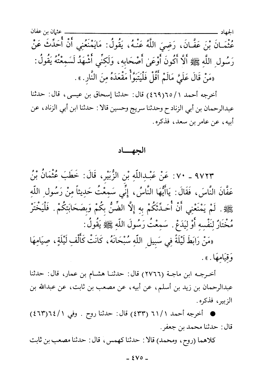 أخرجه أحمد ١/ ٦٥ (٤٦٩) قال: حدَّثنا إِسْحاق بن عِيسَى (ح) وسُرَيْج، وحُسَين، عن عَبْد الرَّحْمان بن أَبي الزِّنَاد، عن أبيه، عن عامر بن سَعْد، فذكره.