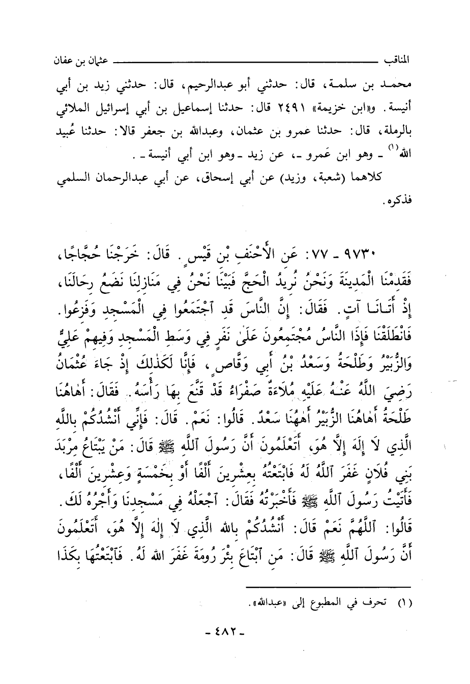 ٩٧٣٠ - عَنِ الأَحْنَفِ بْنِ قَيْسٍ، قَالَ: خَرَجْنَا حُجَّاجًا، فَقَدِمْنَا الْمَدِينَةَ، وَنَحْنُ نُرِيدُ الْحَجَّ، فَبَيْنَا نَحْنُ فِي مَنَازِلِنَا، نَضَعُ رِحَالَنَا، إِذْ أَتَانَا آتٍ، فَقَالَ: إِنَّ النَّاسَ قَدِ اجْتَمَعُوا فِي الْمَسْجِدِ، وَفَزِعُوا، فَانْطَلَقْنَا، فَإِذَا النَّاسُ مُجْتَمِعُونَ عَلَى نَفَرٍ، فِي وَسَطِ الْمَسْجِدِ، وَفِيهِمْ عَلِيٌّ، وَالزُّبَيْرُ، وَطَلْحَةُ، وَسَعْدُ بْنُ أَبِي وَقَّاصٍ، فَإِنَّا لَكَذَلِكَ، إِذْ جَاءَ عُثْمَانُ، رَضِيَ اللَّهُ عَنْهُ، عَلَيْهِ مُلَاءَةٌ صَفْرَاءُ، قَدْ قَنَّعَ بِهَا رَأْسَهُ، فَقَالَ: أَهَا هُنَا طَلْحَةُ، أَهَا هُنَا الزُّبَيْرُ، أَهَا هُنَا سَعْدٌ؟ قَالُوا: نَعَمْ، قَالَ: