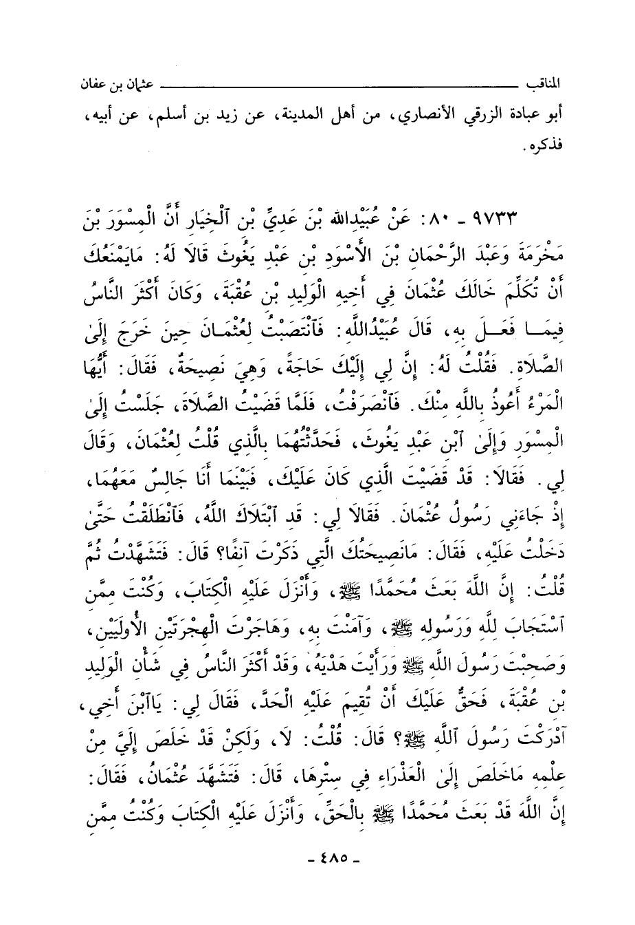 ٩٧٣٣ - عَنْ عُبَيْدِ اللهِ بْنِ عَدِيِّ بْنِ الْخِيَارِ، أَنَّ الْمِسْوَرَ بْنَ مَخْرَمَةَ، وَعَبْدَ الرَّحْمَانِ بْنَ الأَسْوَدِ بْنِ عَبْدِ يَغُوثَ، قَالَا لَهُ: مَا يَمْنَعُكَ أَنْ تُكَلِّمَ خَالَكَ عُثْمَانَ فِي أَخِيهِ الْوَلِيدِ بْنِ عُقْبَةَ، وَكَانَ أَكْثَرَ النَّاسُ فِيمَا فَعَلَ بِهِ، قَالَ عُبَيْدُ اللهِ: فَانْتَصَبْتُ لِعُثْمَانَ حِينَ خَرَجَ إِلَى الصَّلَاةِ، فَقُلْتُ لَهُ: إِنَّ لِي إِلَيْكَ حَاجَةً، وَهْي نَصِيحَةٌ، فَقَالَ: أَيُّهَا الْمَرْءُ، أَعُوذُ بِاللهِ مِنْكَ، فَانْصَرَفْتُ، فَلَمَّا قَضَيْتُ الصَّلَاةَ، جَلَسْتُ إِلَى الْمِسْوَرِ، وَإِلَى ابْنِ عَبْدِ يَغُوثَ، فَحَدَّثْتُهُمَا بِالَّذِي قُلْتُ لِعُثْمَانَ وَقَالَ لِي، فَقَالَا: قَدْ قَضَيْتَ الَّذِي كَانَ عَلَيْكَ، فَبَيْنَمَا أَنَا جَالِسٌ مَعَهُمَا، إِذْ جَاءَنِي رَسُولُ عُثْمَانَ، فَقَالَا لِي: قَدِ ابْتَلَاكَ اللَّهُ، فَانْطَلَقْتُ حَتَّى دَخَلْتُ عَلَيْهِ، فَقَالَ: مَا نَصِيحَتُكَ الَّتِي ذَكَرْتَ آنِفًا؟ قَالَ: فَتَشَهَّدْتُ، ثُمَّ قُلْتُ: إِنَّ اللَّهَ بَعَثَ مُحَمَّدًا صلى الله عليه وسلم، وَأَنْزَلَ عَلَيْهِ الْكِتَابَ، وَكُنْتَ مِمَّنِ
